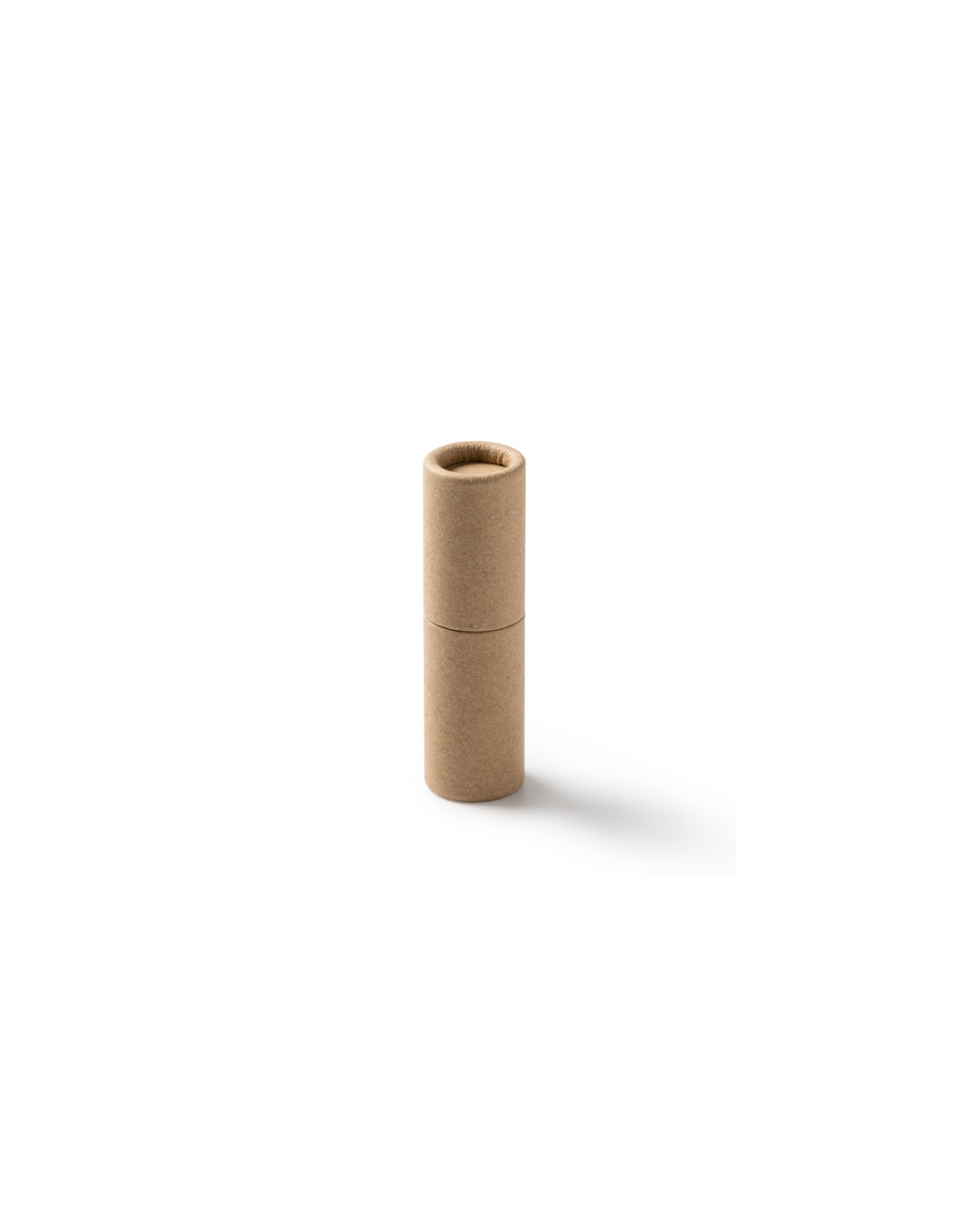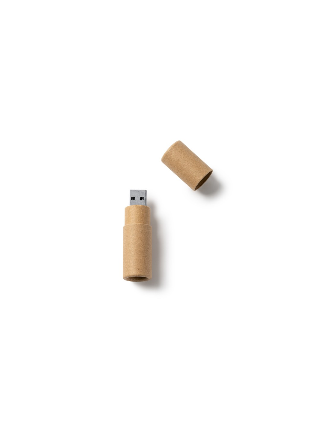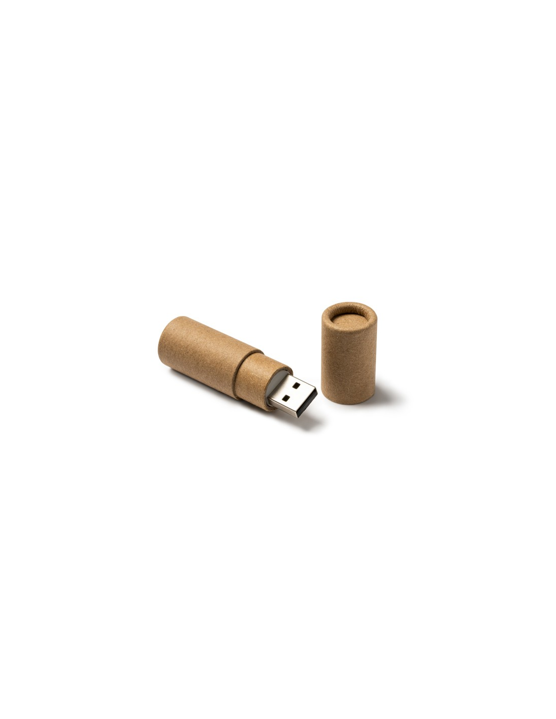 Cylindryczna pamięć USB wykonana z tektury pochodzącej z recyklingu. Zapakowana w pudełku zaprojektowanym z myślą o środowisku.