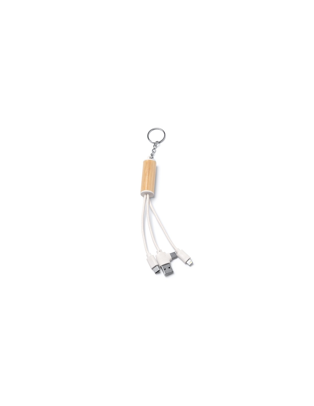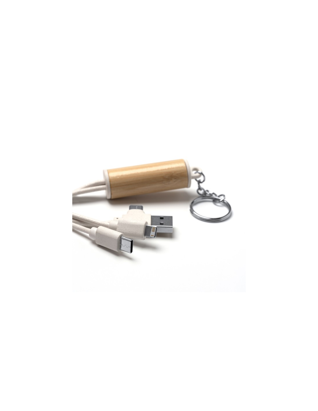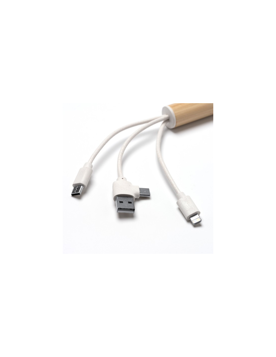 Kabel ładujący 5 w 1. Główna konstrukcja wykonana z bambusa i włókna pszennego. Wyjście USB i USB typu C. Wyjście USB, mikro USB, USB typu C i Lightning. Zapakowany w osobnej torbie zaprojektowanej z myślą o środowisku.