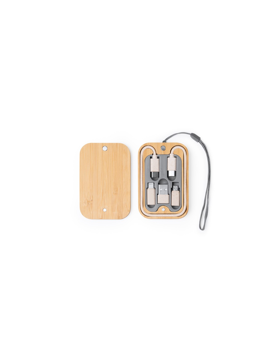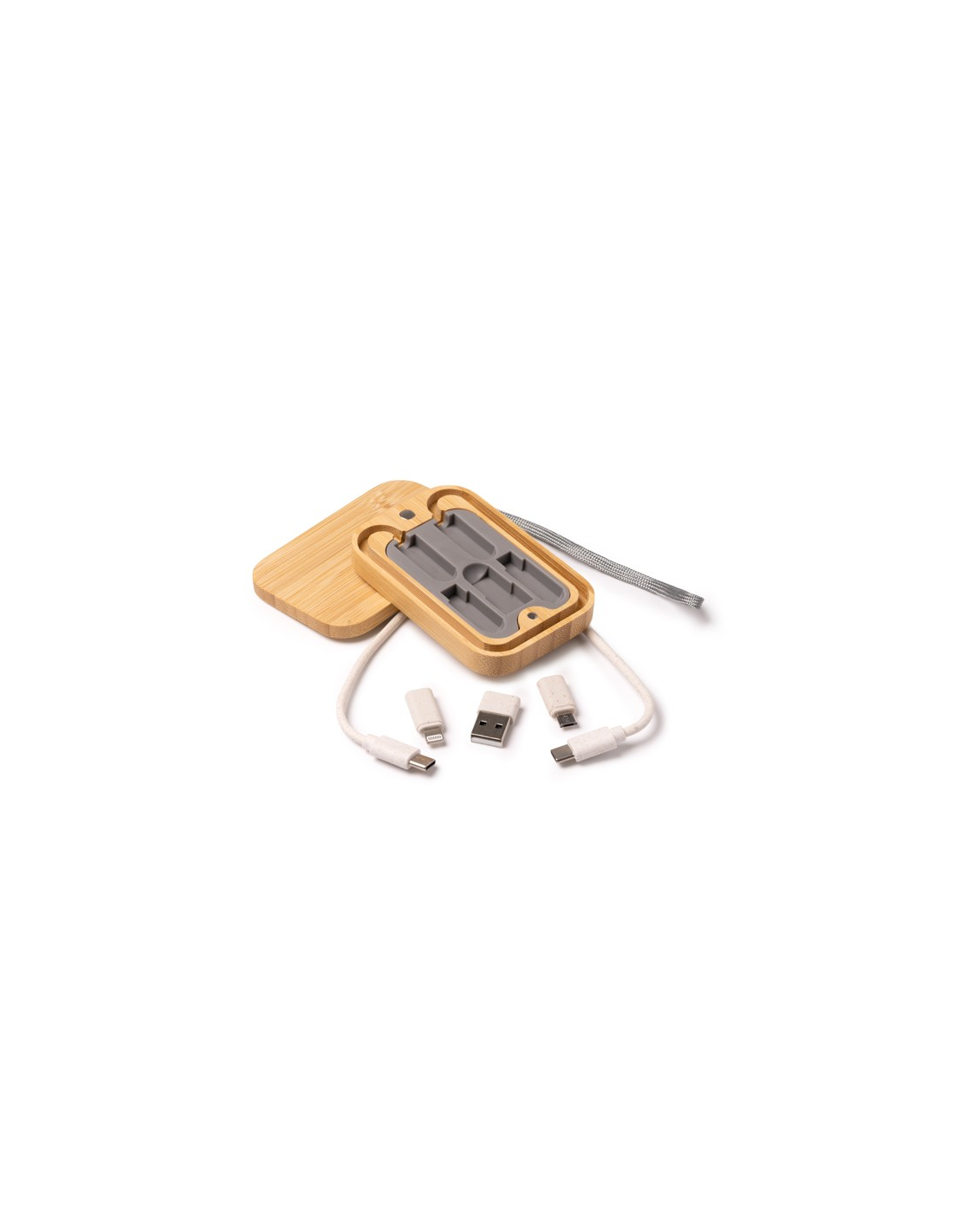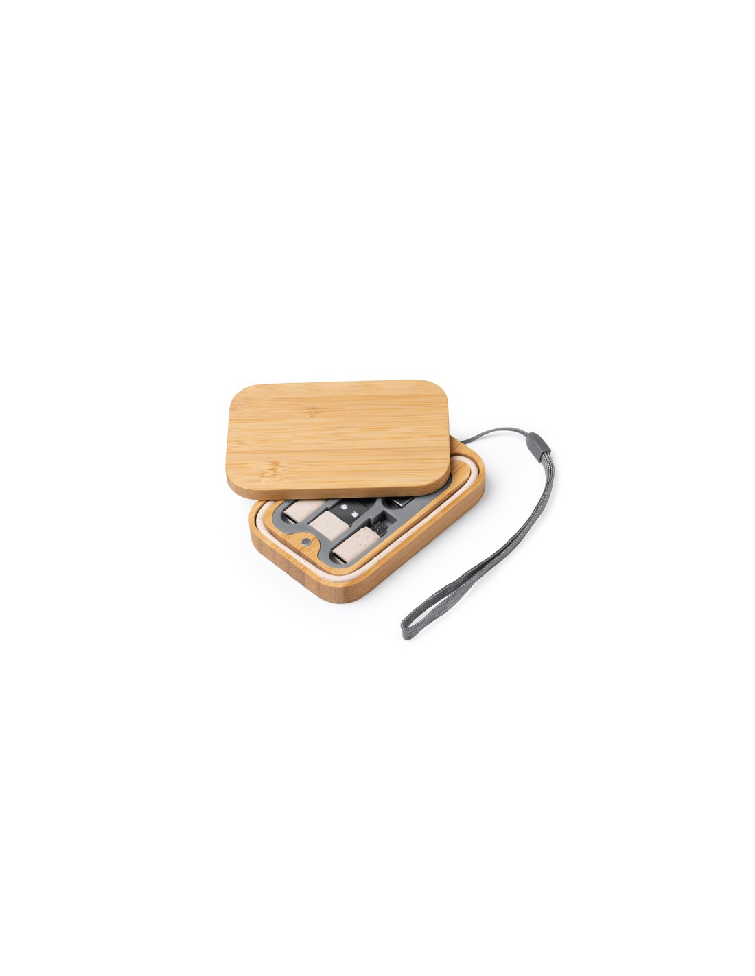 Zestaw kabli ładujących zapakowany w bambusowym etui z namagnesowaną pokrywą. Złącze micro USB, USB typu C i Lightning. Praktyczny uchwyt do przenoszenia w zestawie. Zapakowany w pudełku zaprojektowanym z myślą o środowisku.