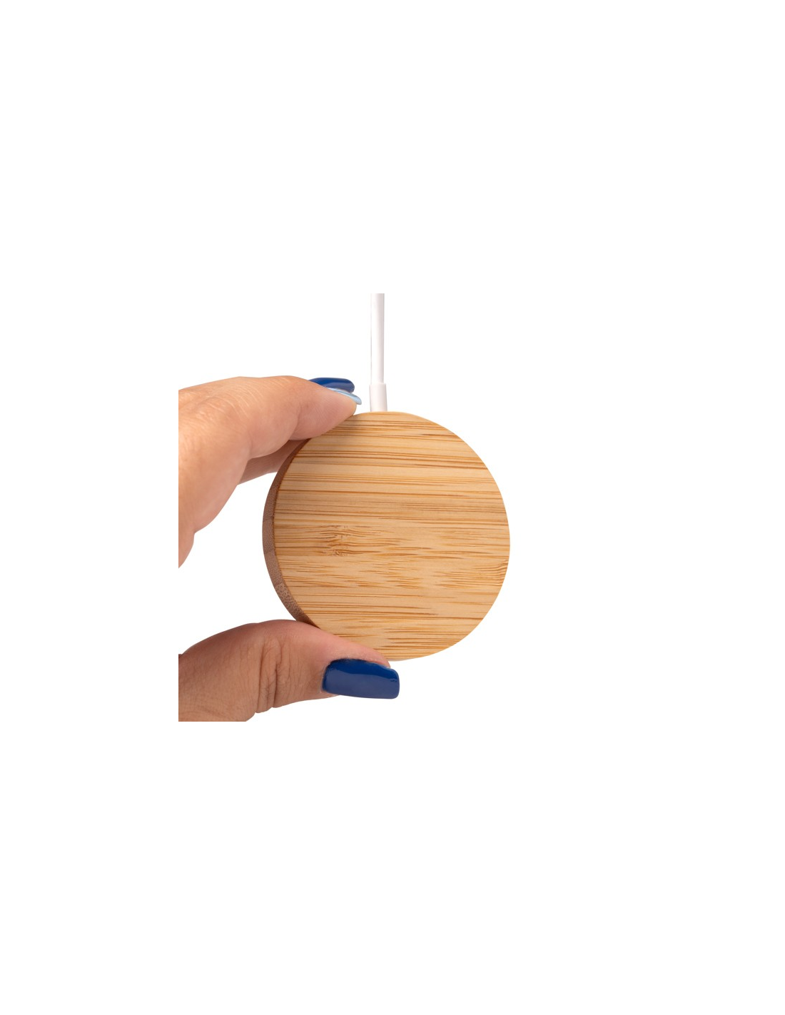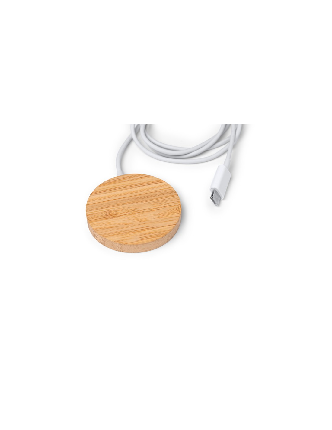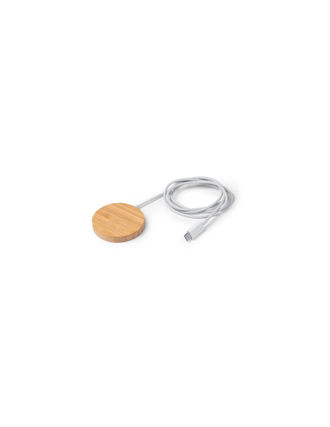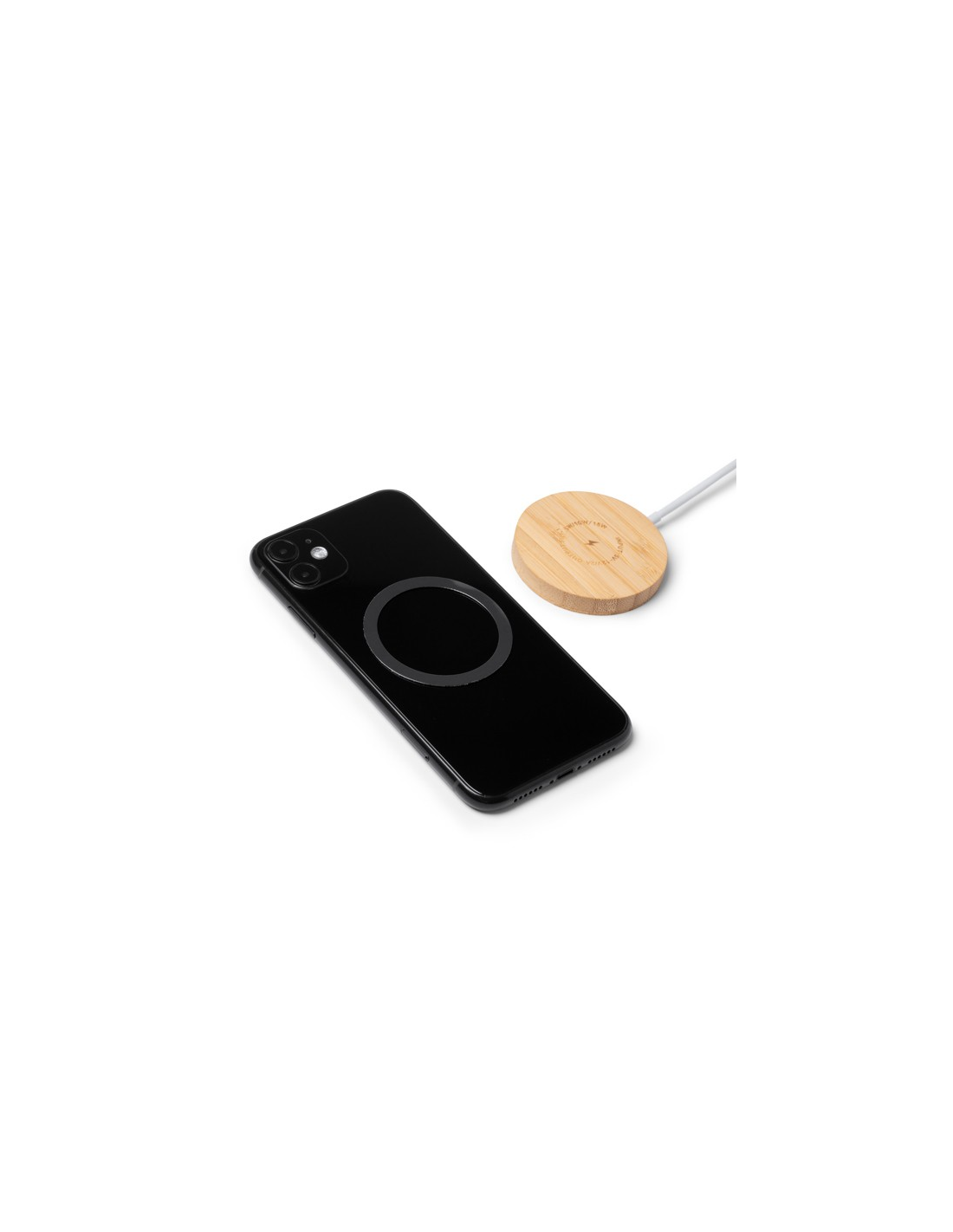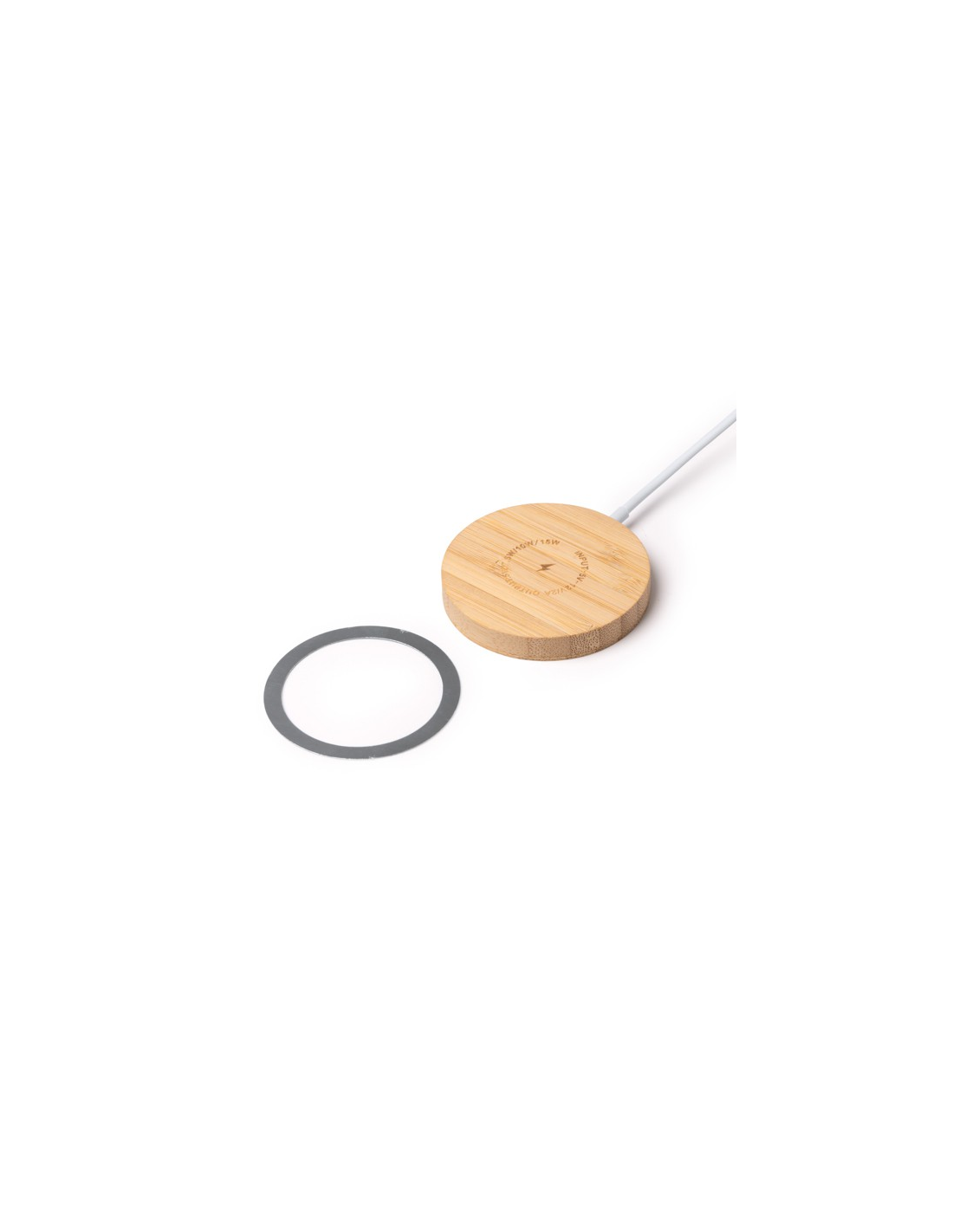 Bezprzewodowa ładowarka z główną konstrukcją wykonaną z bambusa, oferująca funkcję magnetyczną. Ładowanie: 15 W. Wejście USB typu C. Dodatkowy pierścień samoprzylepny w zestawie. Zapakowana w pudełku zaprojektowanym z myślą o środowisku.