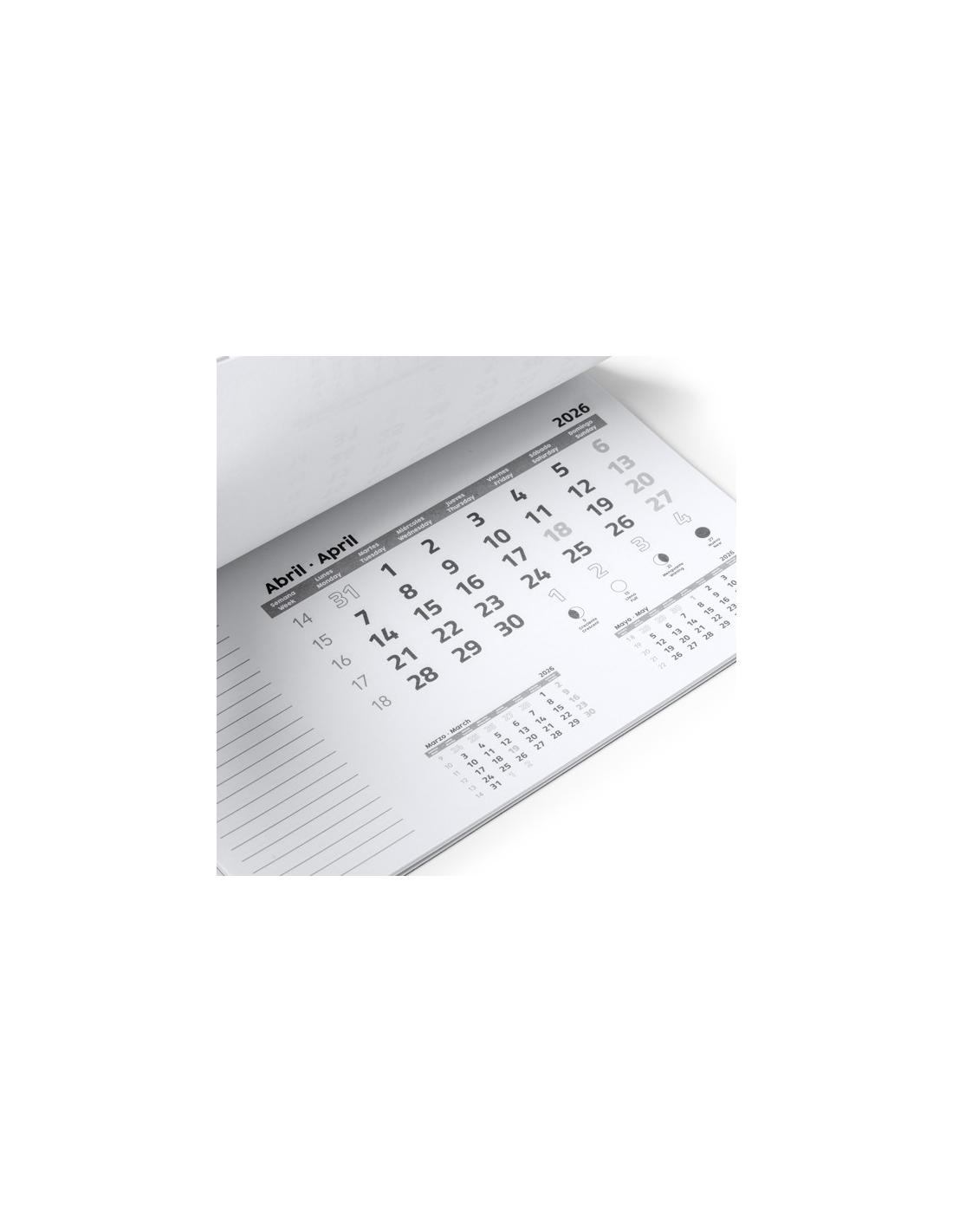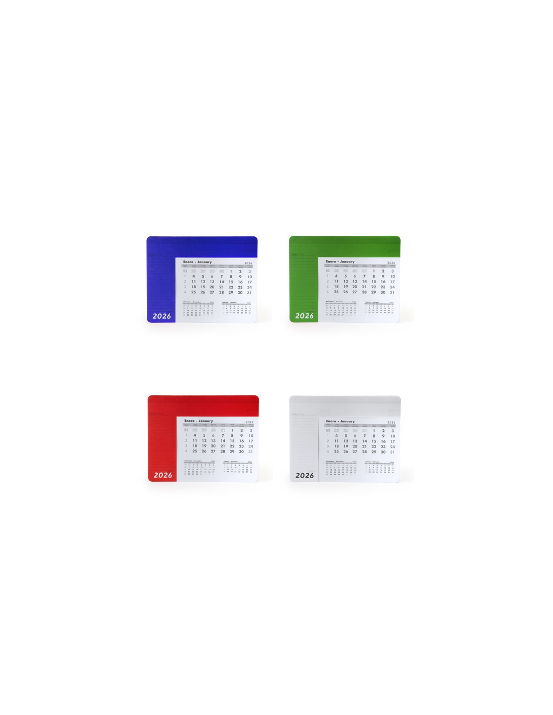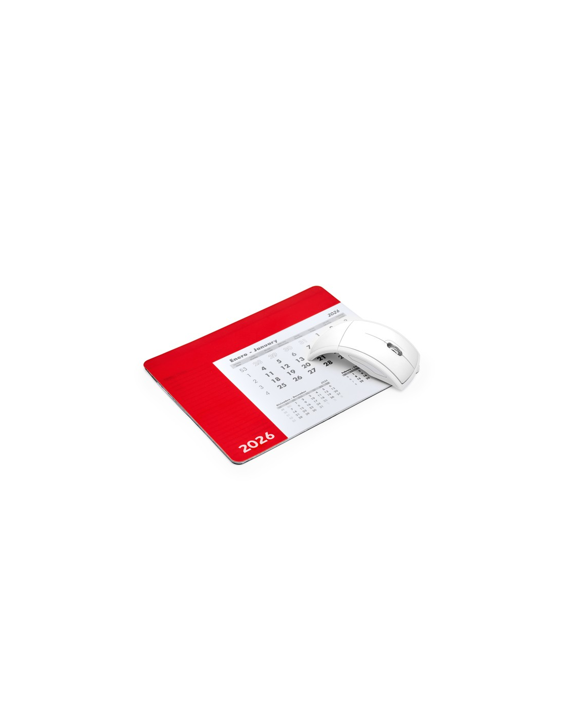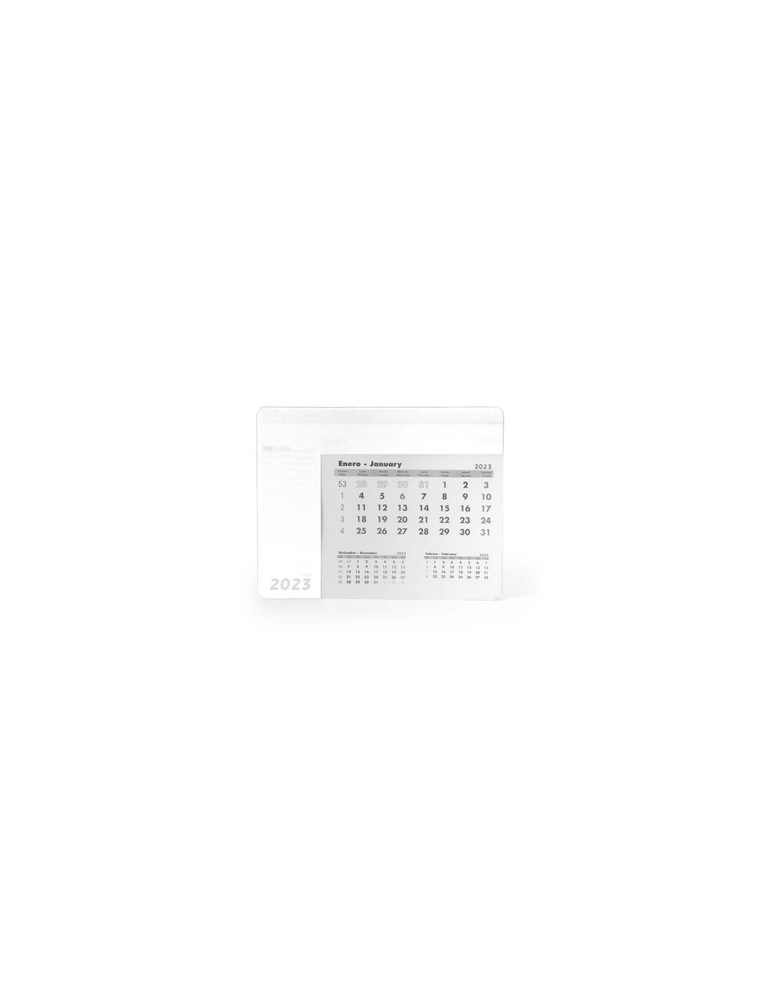 Prostokątna podkładka pod mysz z kalendarzem. Jednokolorowa, przezroczysta okładka, za którą widać arkusz z odpowiednim miesiącem. Podnoszona okładka odsłania 12-stronicowy kalendarz w języku angielskim i hiszpańskim, którego strony można wyrywać. Każdy arkusz miesięczny zawiera bieżący miesiąc, miesiąc poprzedni i następny. Czarna, antypoślizgowa podstawa. Gramatura papieru 80 g/m². Grubość okładki 0,3 cm.