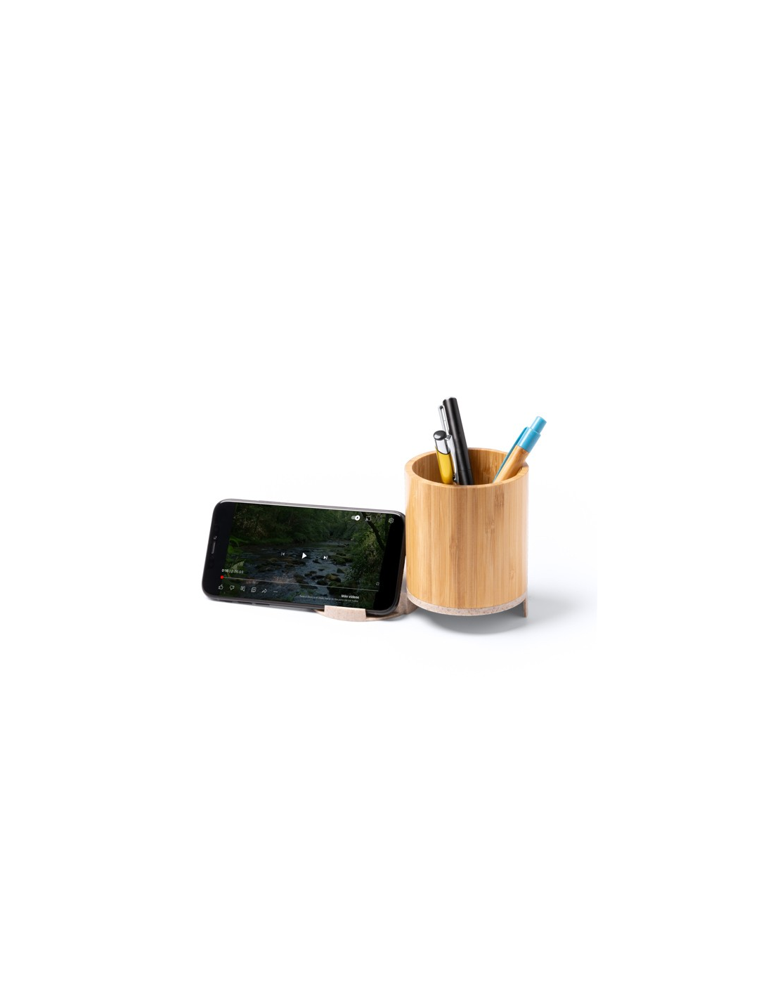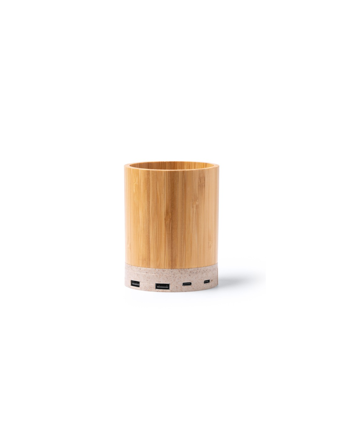 Uchwyt na ołówek z główną konstrukcją wykonaną z bambusa i podstawą z funkcją bezprzewodowej ładowarki z włókna pszennego. Moc wyjściowa: 15 W. Port USB wbudowany w podstawę z dwoma portami wyjściowymi USB typu C i dwoma portami wyjściowymi USB. Zapakowany w pudełku zaprojektowanym z myślą o środowisku.