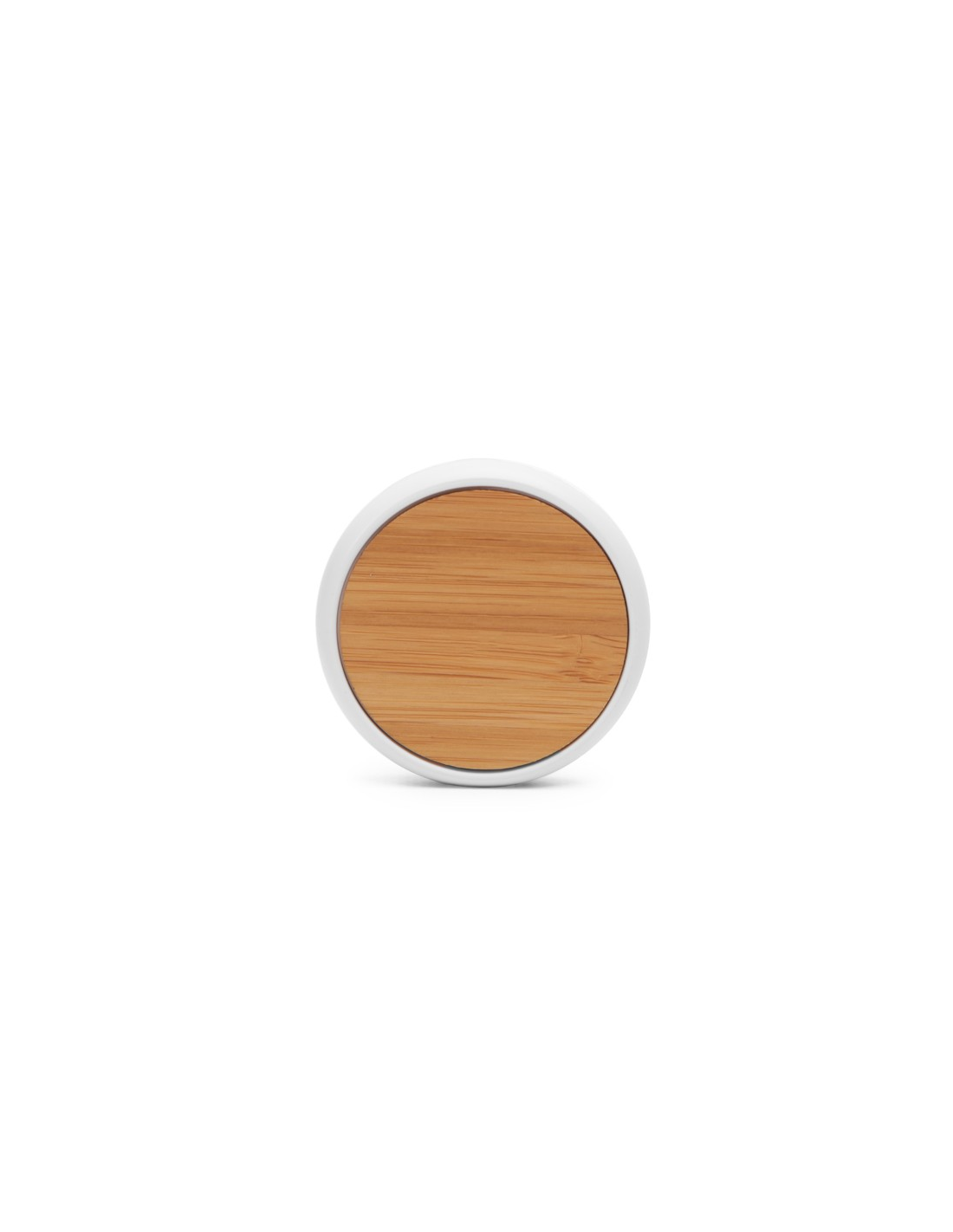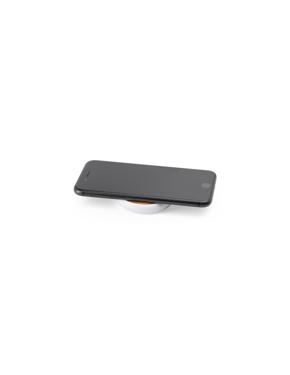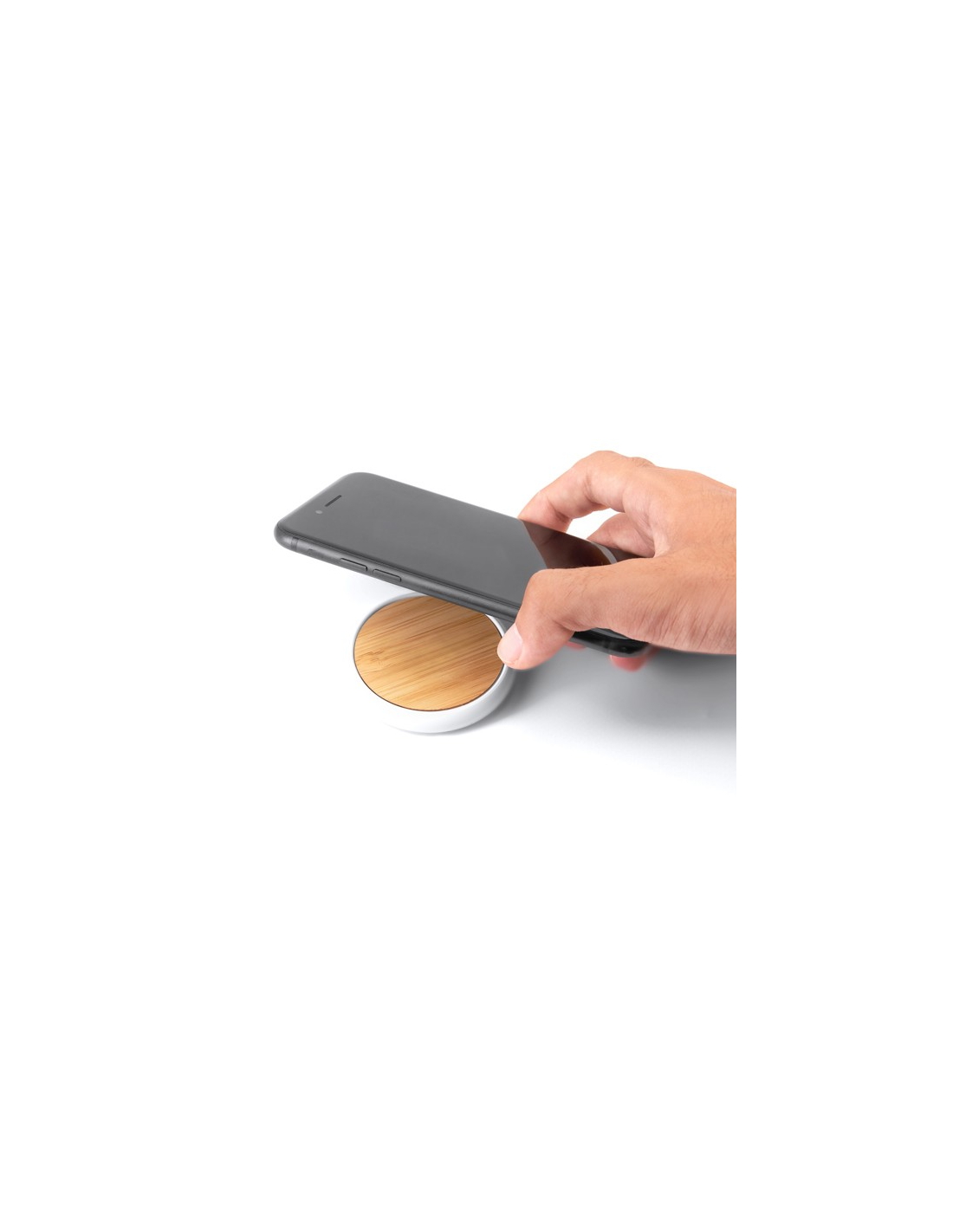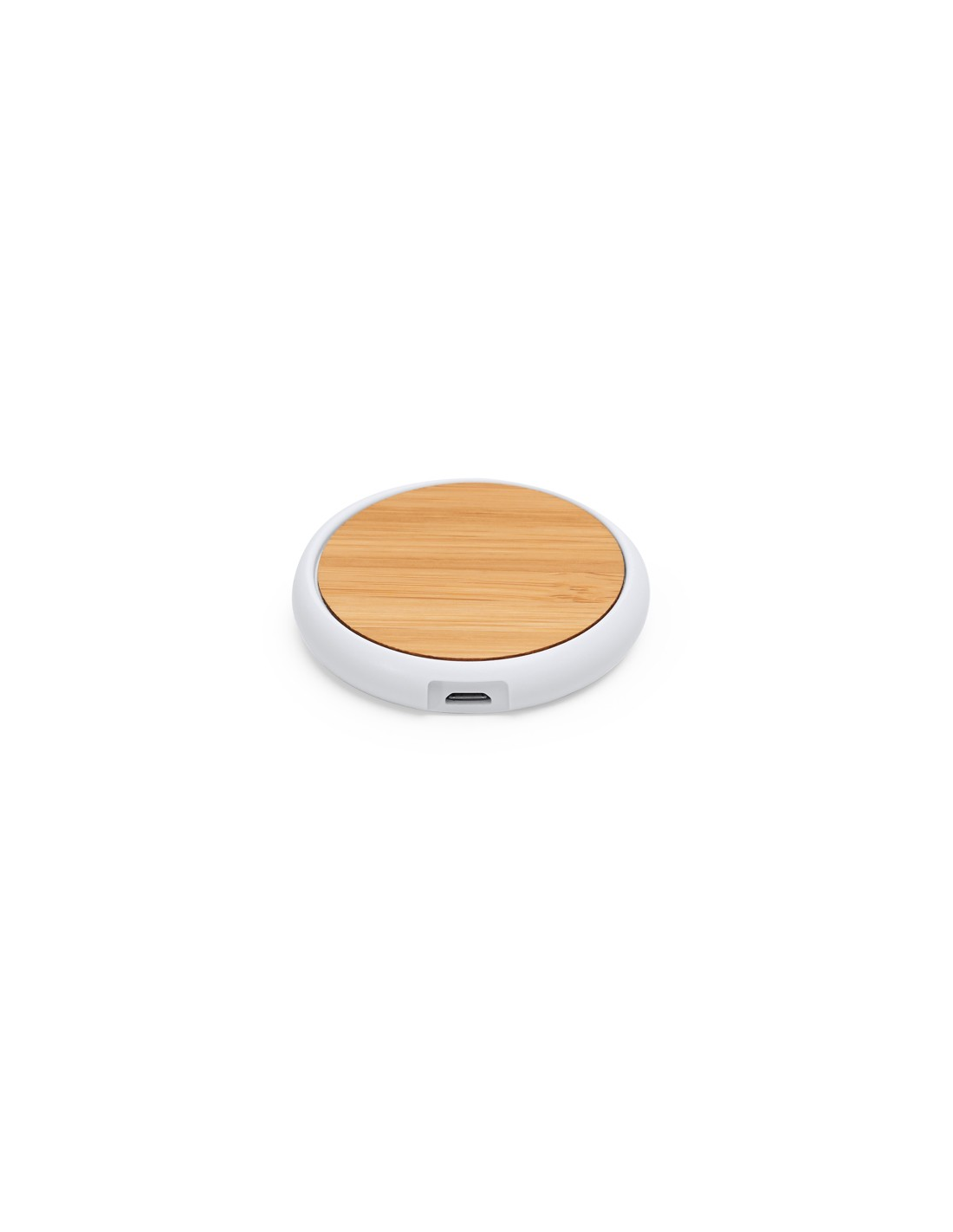 5W bezprzewodowa ładowarka z białym ABS ciała i naturalnej powierzchni bambusa. Umieść na nim swój smartfon i pozwól mu się naładować. Kabel w zestawie.