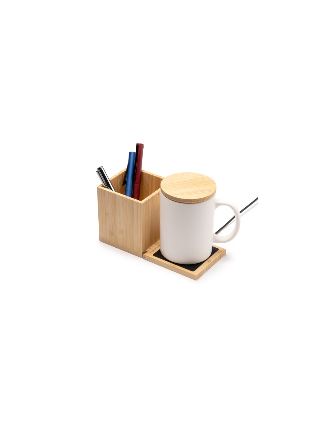 Innowacyjny uchwyt na pióro ze składanym podgrzewaczem do kubków, wykonany z bambusa, jest idealny do utrzymywania napoju w idealnej temperaturze, jednocześnie organizując przybory na biurku. Zawiera 1-metrowy kabel z wyjściami USB i Type-C, zapewniając wszechstronność i łatwość użytkowania. Jego składana konstrukcja pozwala na łatwe przechowywanie i transport. Prezentowany w ekologicznym pudełku, to akcesorium łączy w sobie funkcjonalność i zrównoważony rozwój, idealne dla każdego nowoczesnego środowiska pracy.