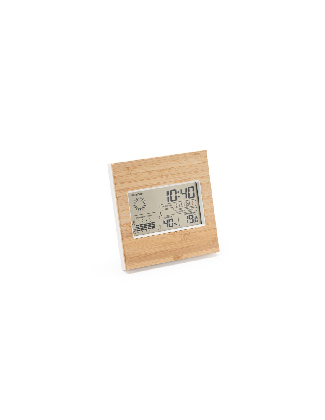 Remarks: Zapakowana w pudełku zaprojektowanym z myślą o środowisku. Stacja pracuje na 2 bateriach AAA (brak w zestawie).Materiał obudowy: ABS Materiał frontu: bambus Zakres temperatury: 0-50ºC Zakres wilgotności: 20-99% Zakres kalendarza: 2000-2099 Instrukcja obsługi w 6 językach: hiszpańskim, angielskim, francuskim, włoskim, niemieckim i portugalskim.