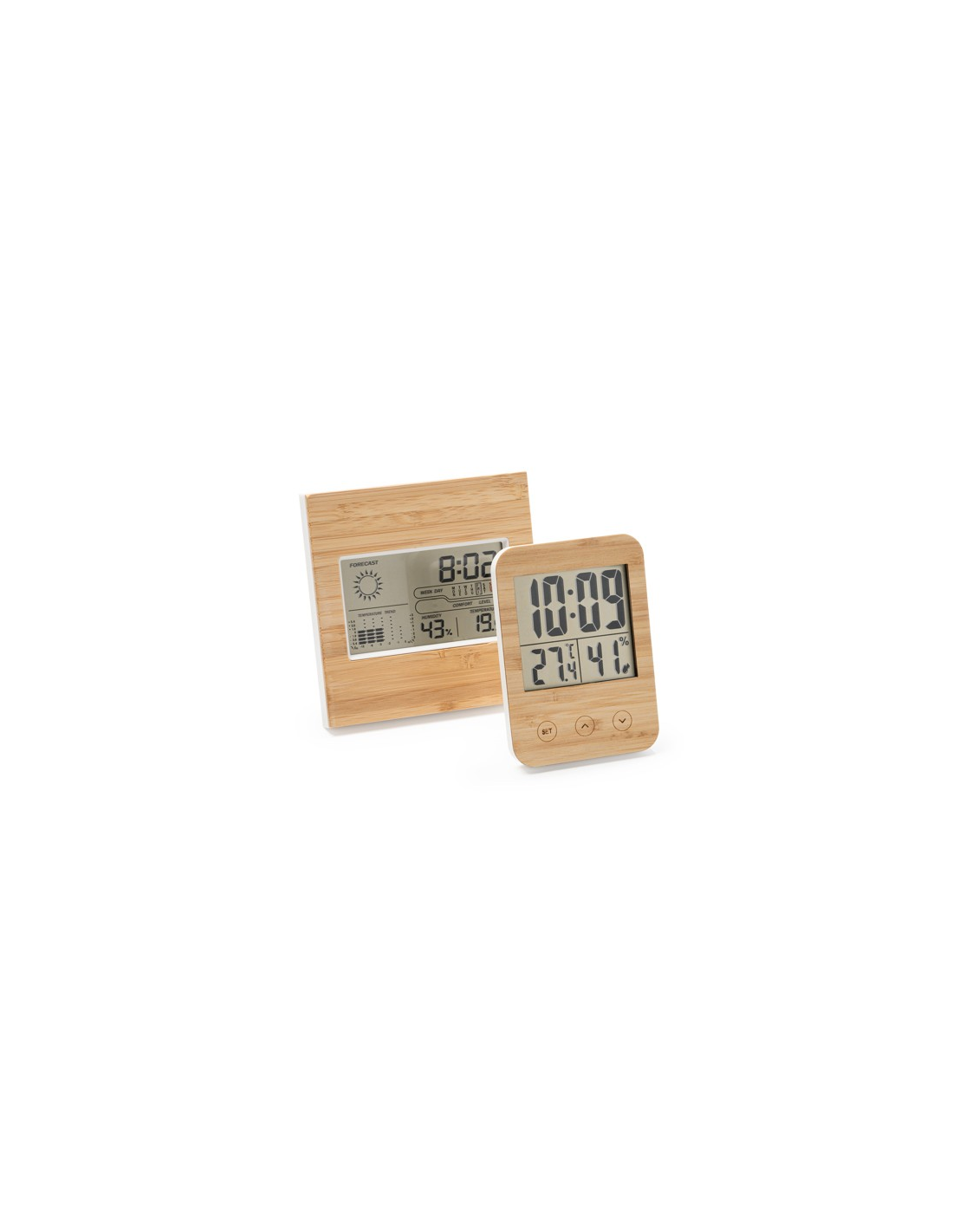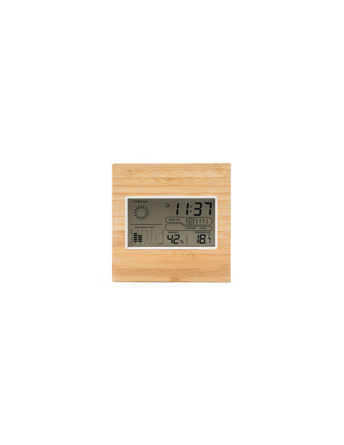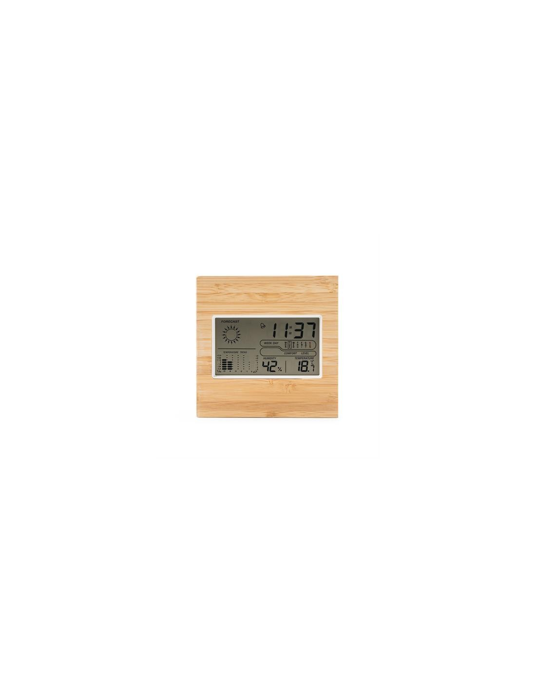 Stacja pogodowa z bambusową obudową przednią. Zegar, kalendarz i funkcja alarmu z czujnikami temperatury i wilgotności.
