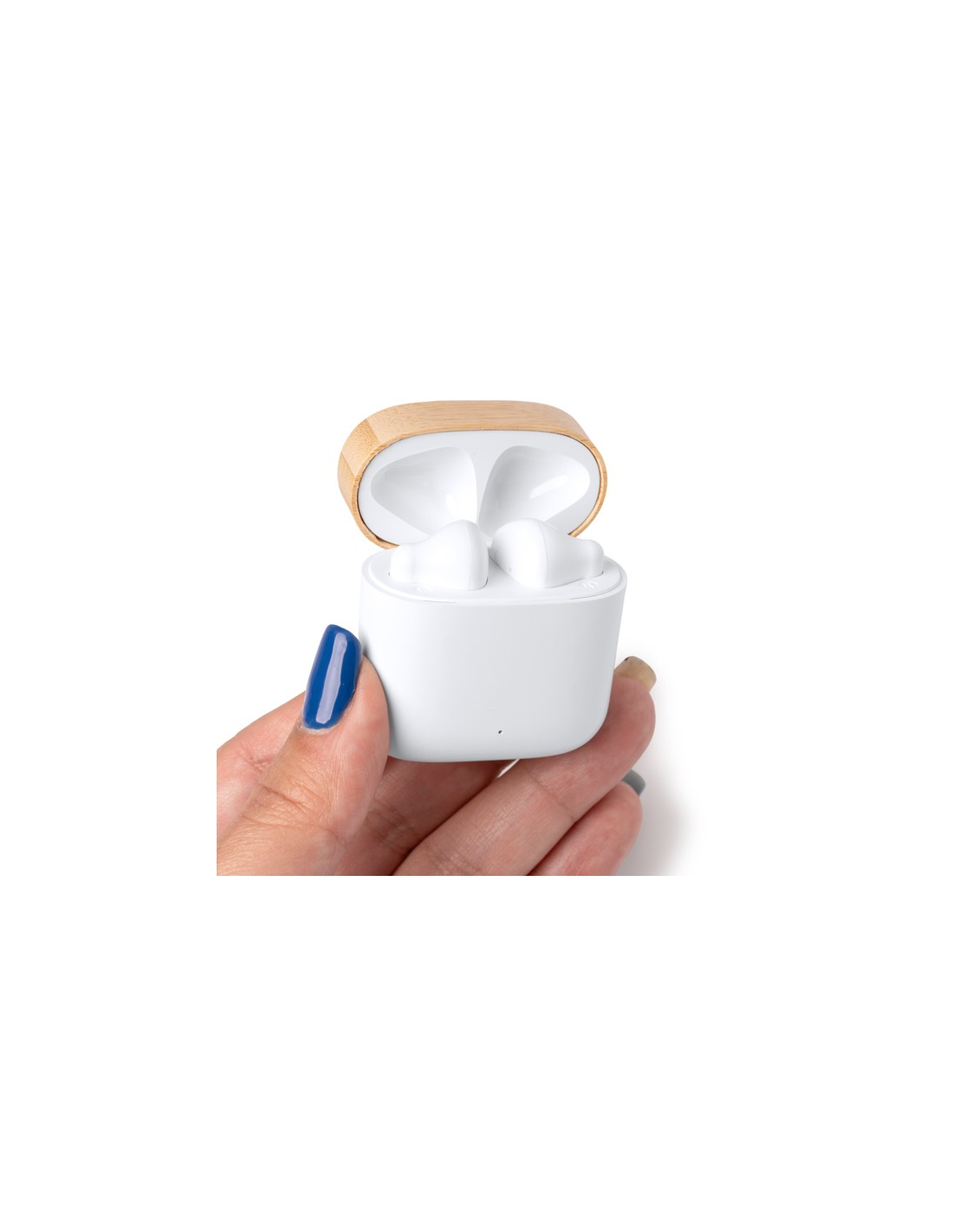 Bezprzewodowe słuchawki douszne zapakowane w etui wykonanym z tworzywa ABS i pochodzącego z recyklingu i bambusa. Wbudowany panel sterowania wykonany w technologii dotykowej. Funkcja głośnomówiąca. Akumulator. Kabel USB typu C w zestawie. Zapakowany w pudełku zaprojektowanym z myślą o środowisku.