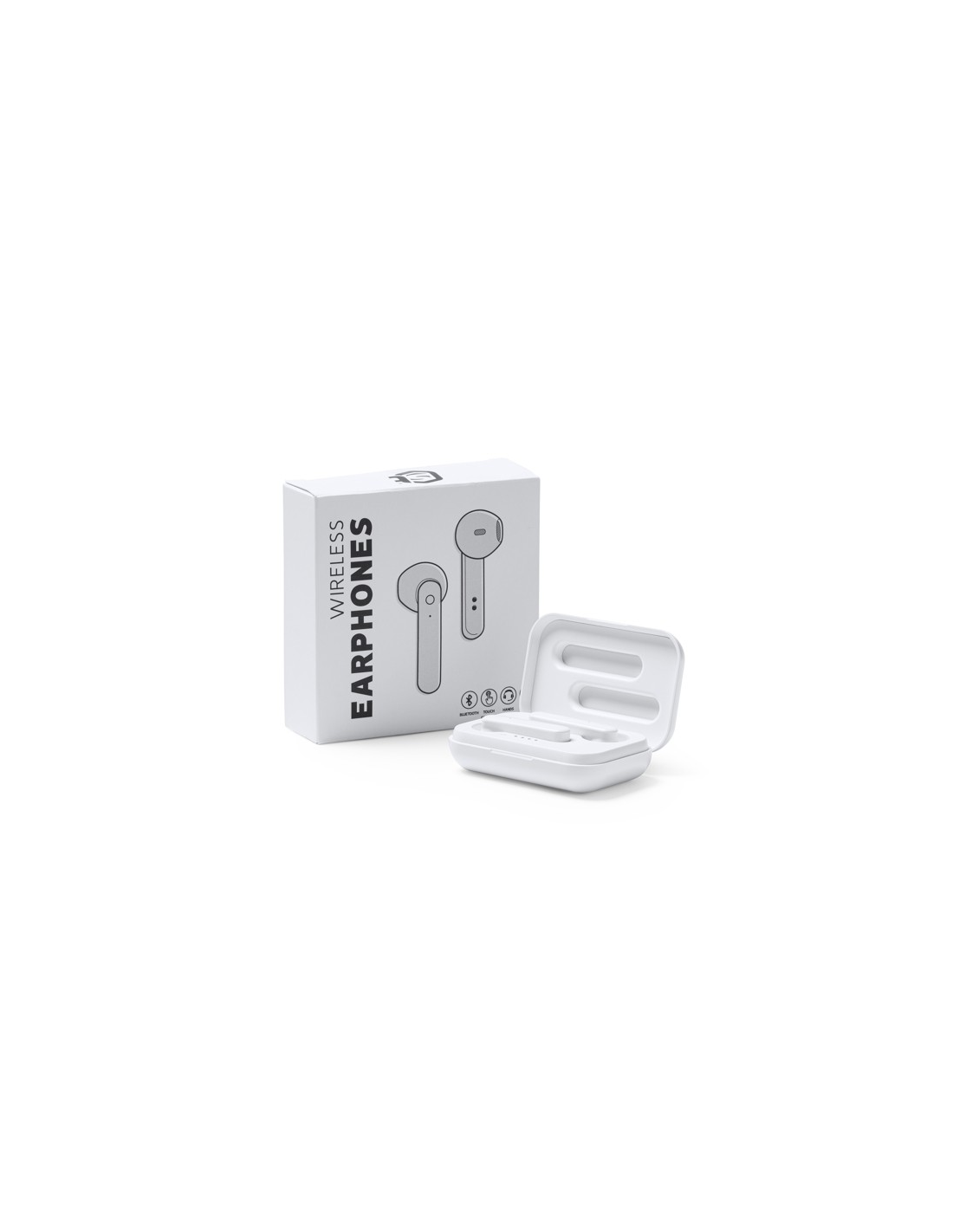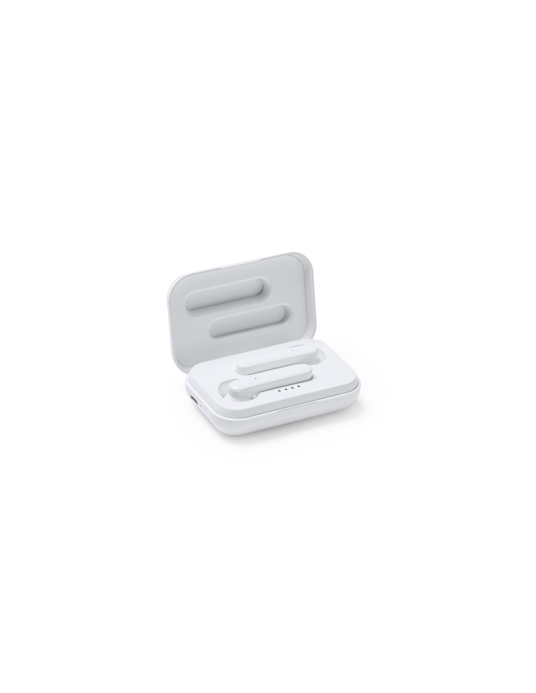 Bezprzewodowe słuchawki Bluetooth 5.0 z etui do ładowania. Stylowe, błyszczące białe wykończenie. Panel sterowania z technologią dotykową wbudowany w słuchawkę. Funkcja zestawu głośnomówiącego. Etui do ładowania z akumulatorem i pokrywą magnetyczną. Dołączony kabel.