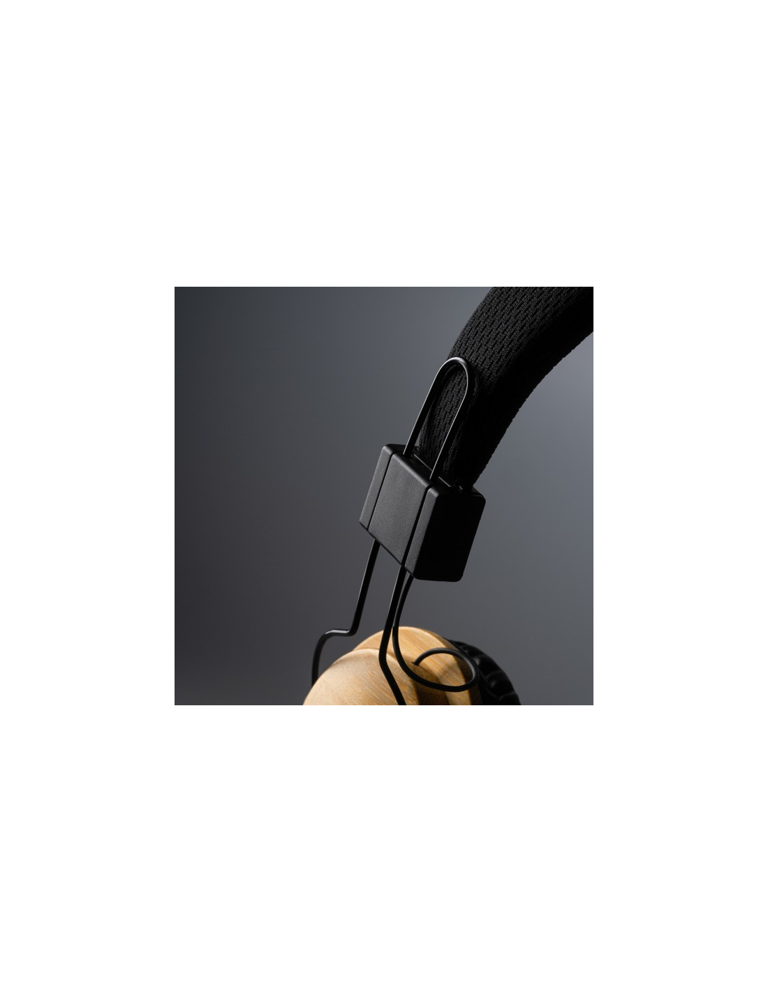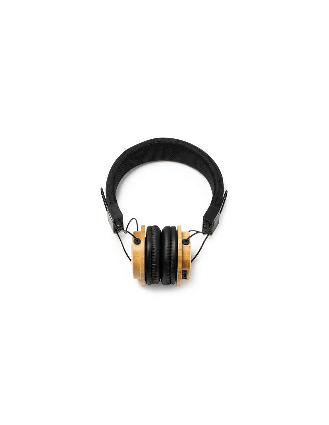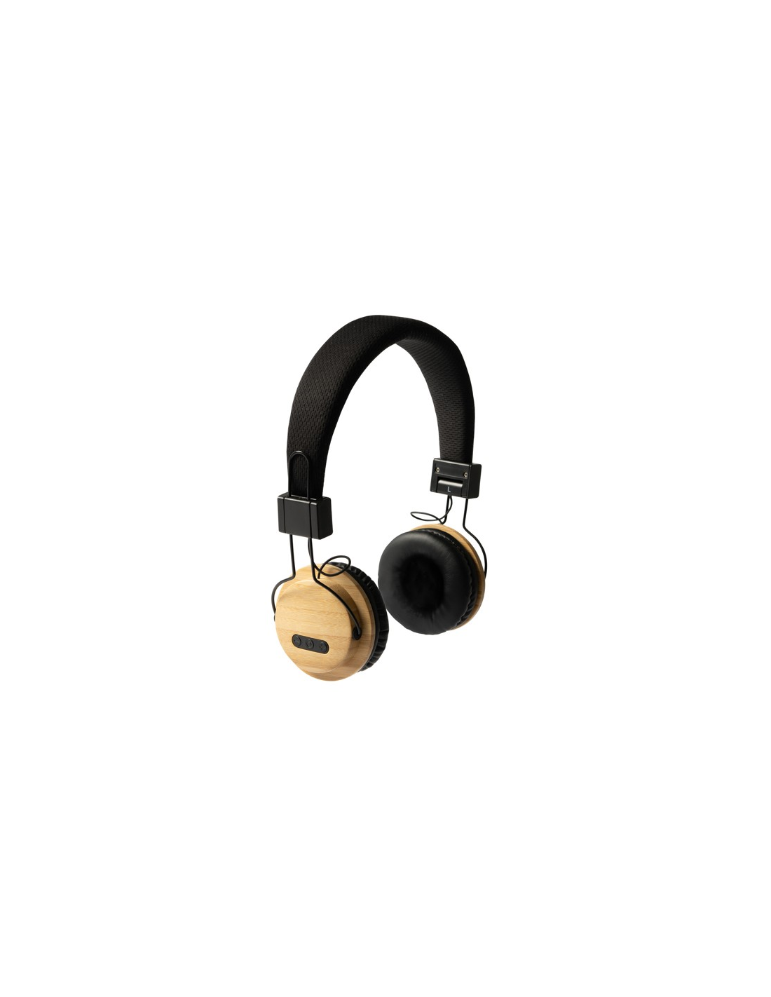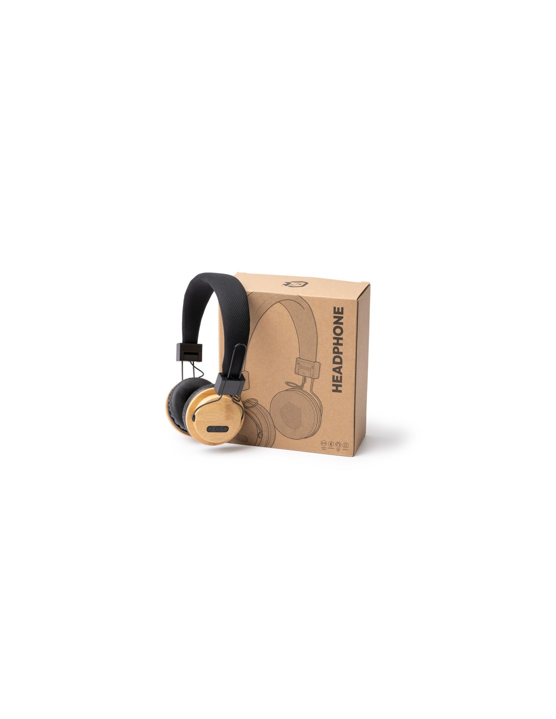 Regulowane słuchawki bezprzewodowe wykonane z bambusa i tkaniny RPET. Wyściełana opaska na głowę i nauszniki. Wbudowany dotykowy panel sterowania wykonany w technologii stereo. Funkcja głośnomówiąca. Akumulator. Kabel USB typu C w zestawie. Zapakowane w pudełku zaprojektowanym z myślą o środowisku.