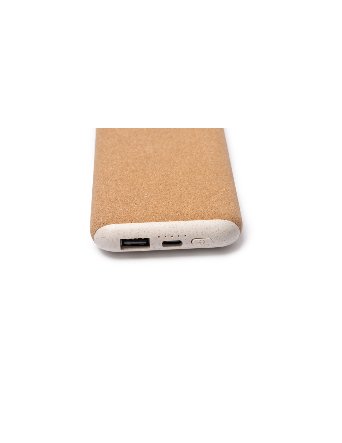 Power bank z konstrukcją wykonaną z włókna pszennego i korka. Pojemność: 10 000 mAh. Bezprzewodowe szybkie ładowanie: 15 W. Wyjście USB typu C i USB o mocy 20 W. Kabel USB typu C w zestawie. Zapakowany w pudełku zaprojektowanym z myślą o środowisku.