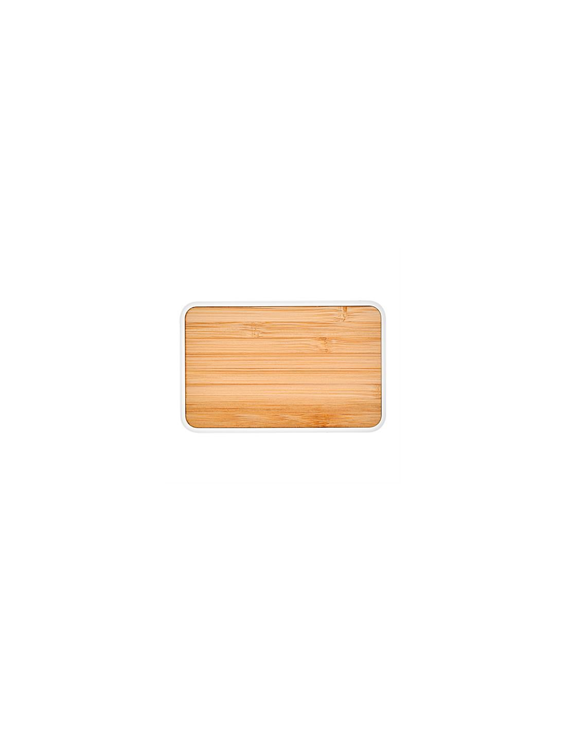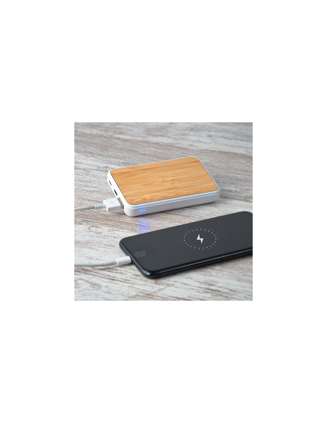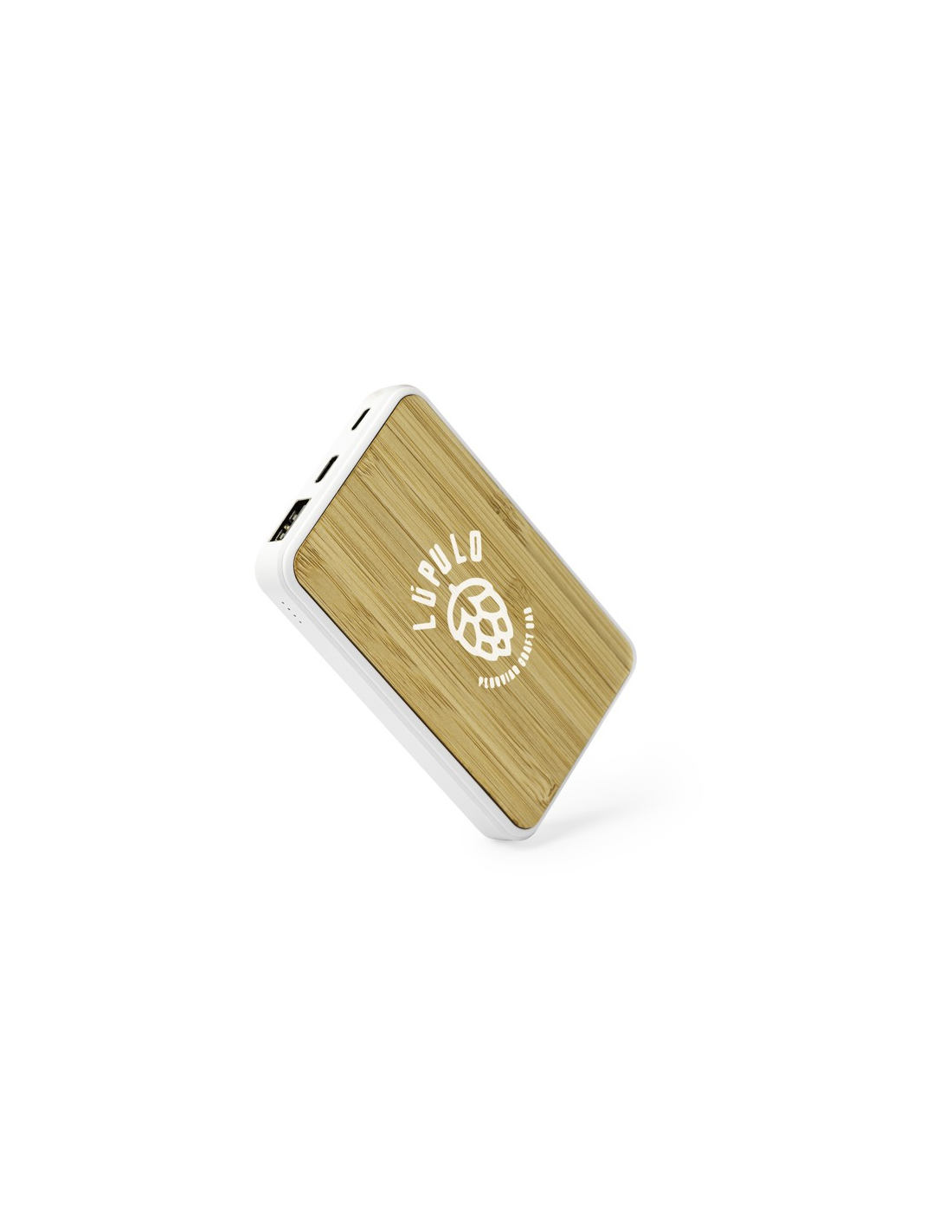 Zewnętrzna bateria o pojemności 5000 mAh, z prostokątną obudową z białego ABS i bambusową powierzchnią. Wyjście zasilania USB DC5V/2.1A. Zawiera kabel Micro USB.