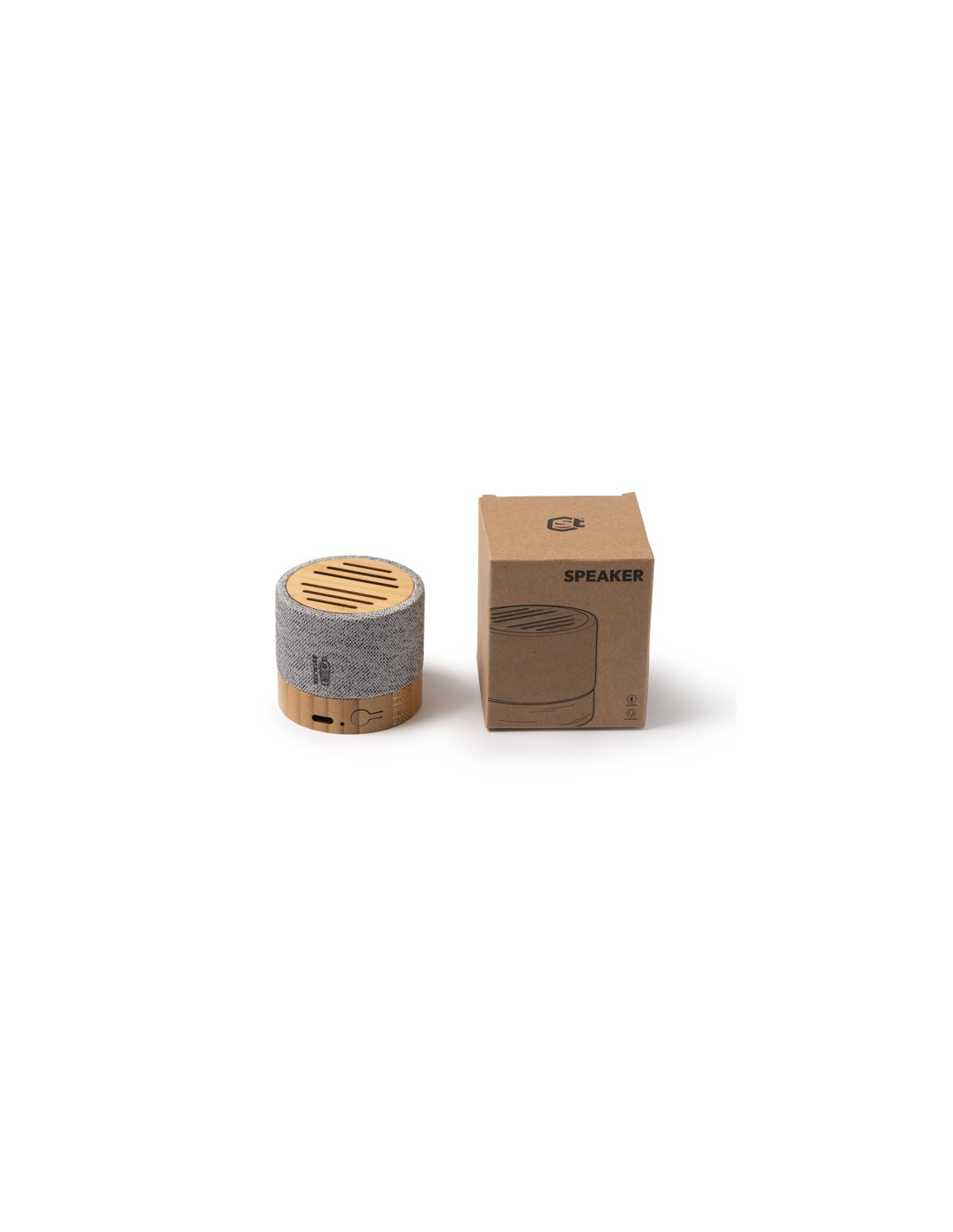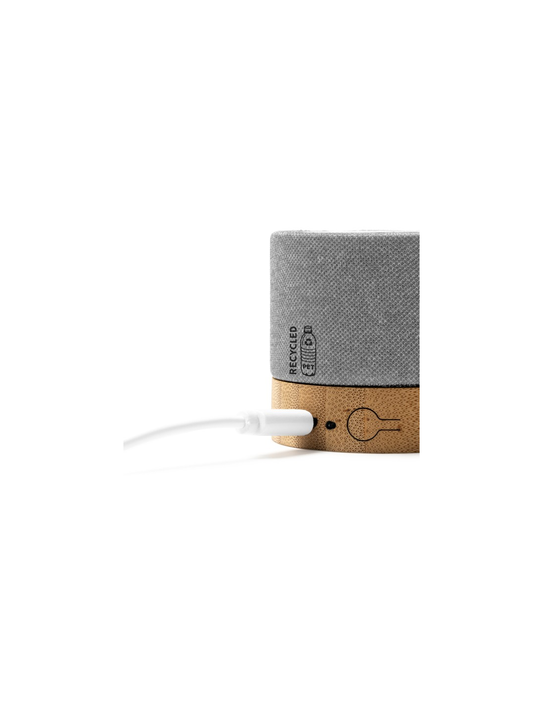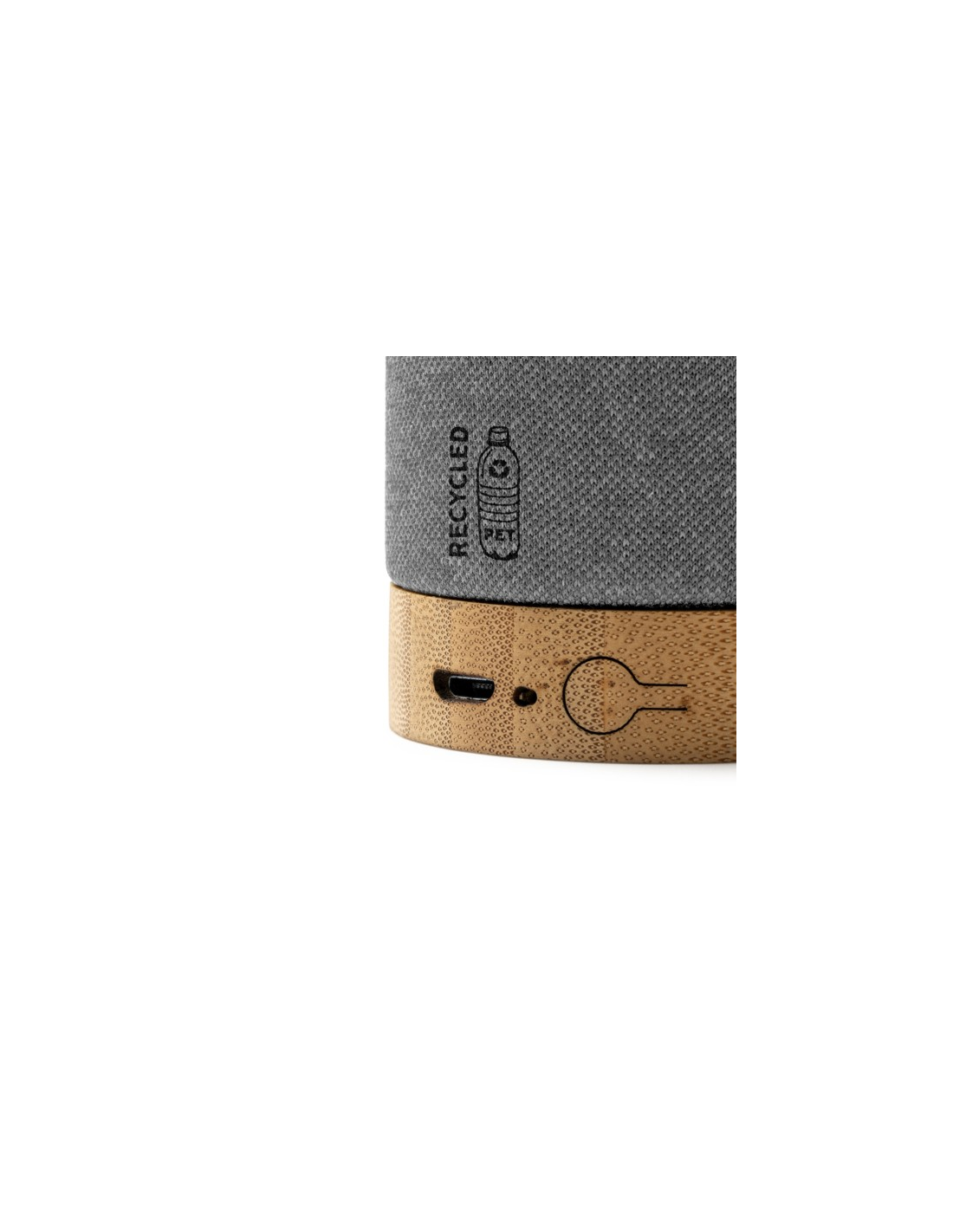 Bezprzewodowy głośnik z bambusowym korpusem i designerską tkaniną RPET. Moc 3W i akumulator. Połączenie typu C. Kabel w zestawie. Głośnik wykonany z materiałów przyjaznych dla środowiska w celu zmniejszenia emisji zanieczyszczeń