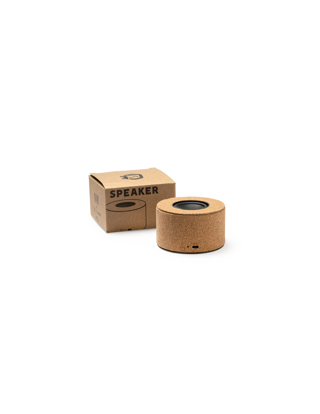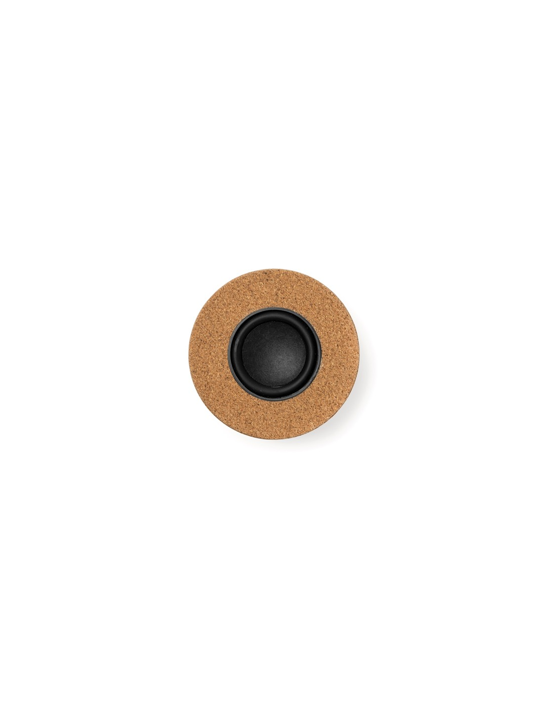 Głośnik z korpusem z naturalnego korka i widoczną membraną. Bluetooth 5.0. Moc 3 W. Bateria wielokrotnego ładowania. Dołączony kabel.