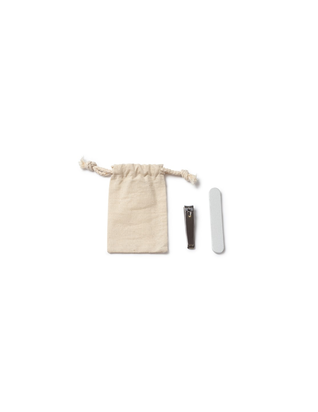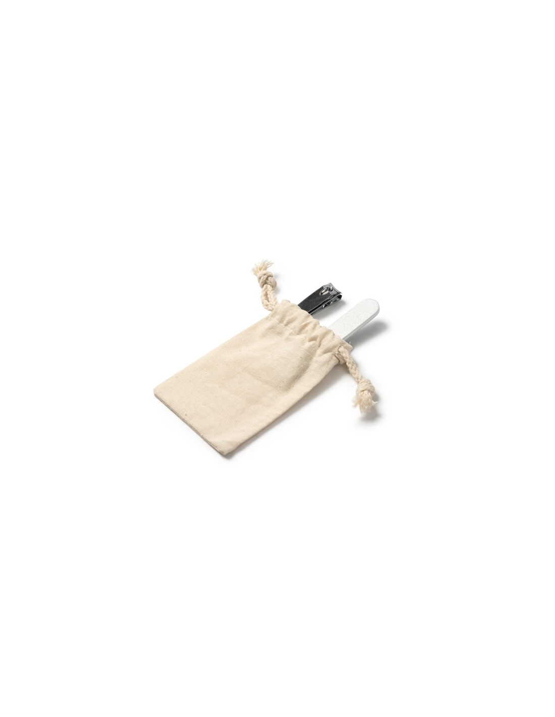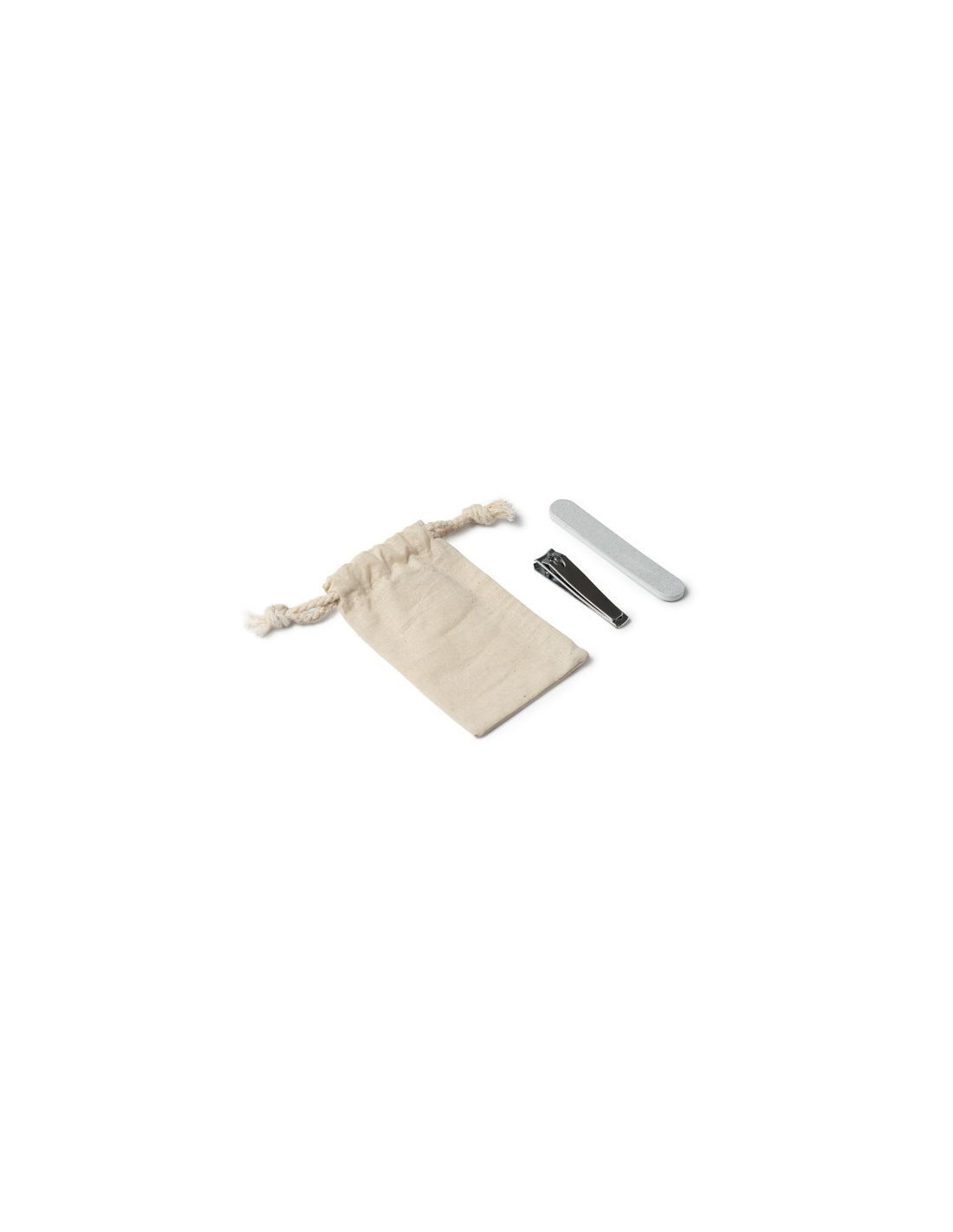 Zestaw do manicure w bawełnianej saszetce ze ściągaczem. Pilnik do paznokci i maszynka do strzyżenia w zestawie.