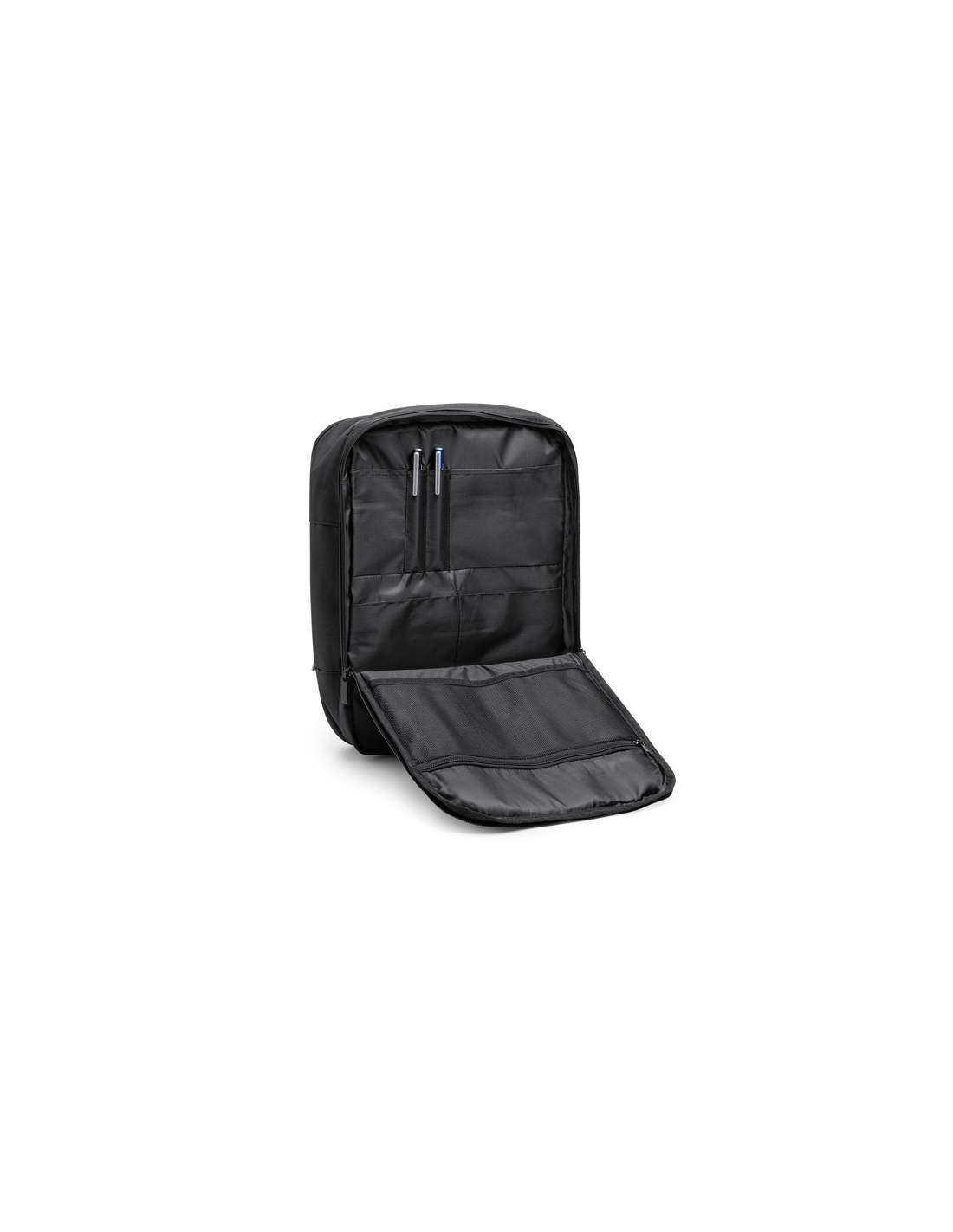 Plecak podróżny Executive wykonany z poliestru 300D. Dwie główne wyściełane kieszenie z komorami wewnętrznymi i przegrodami idealnymi do przechowywania laptopa lub tabletu. Wyściełane plecy i szelki. Kieszeń maskująca pasek i pasek do mocowania.