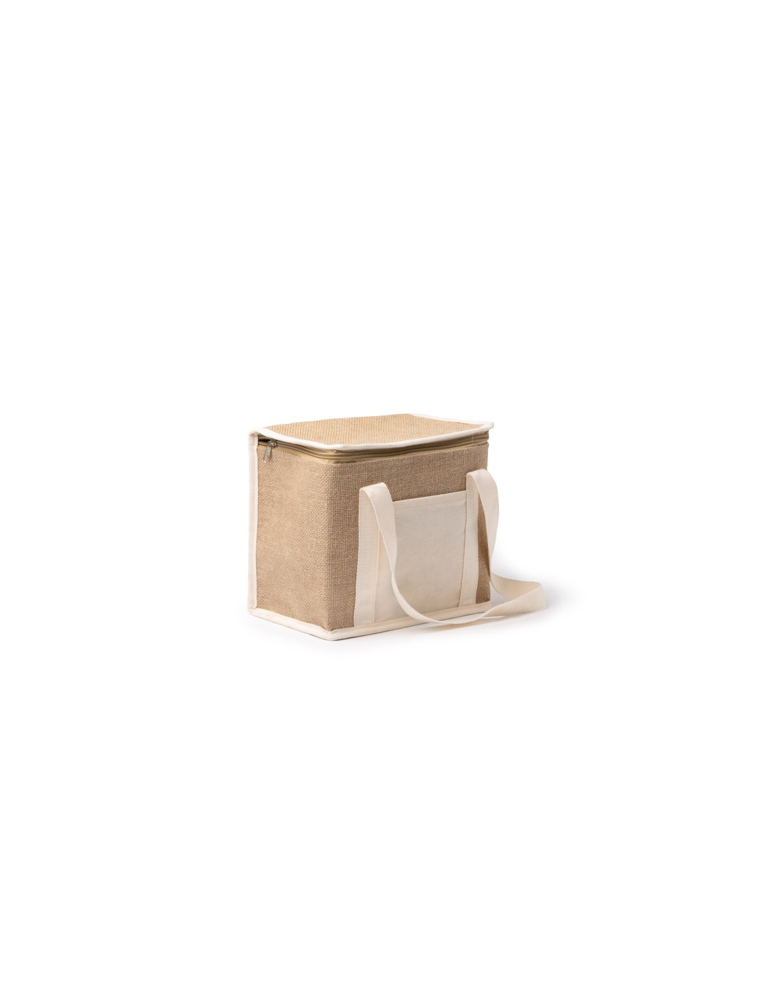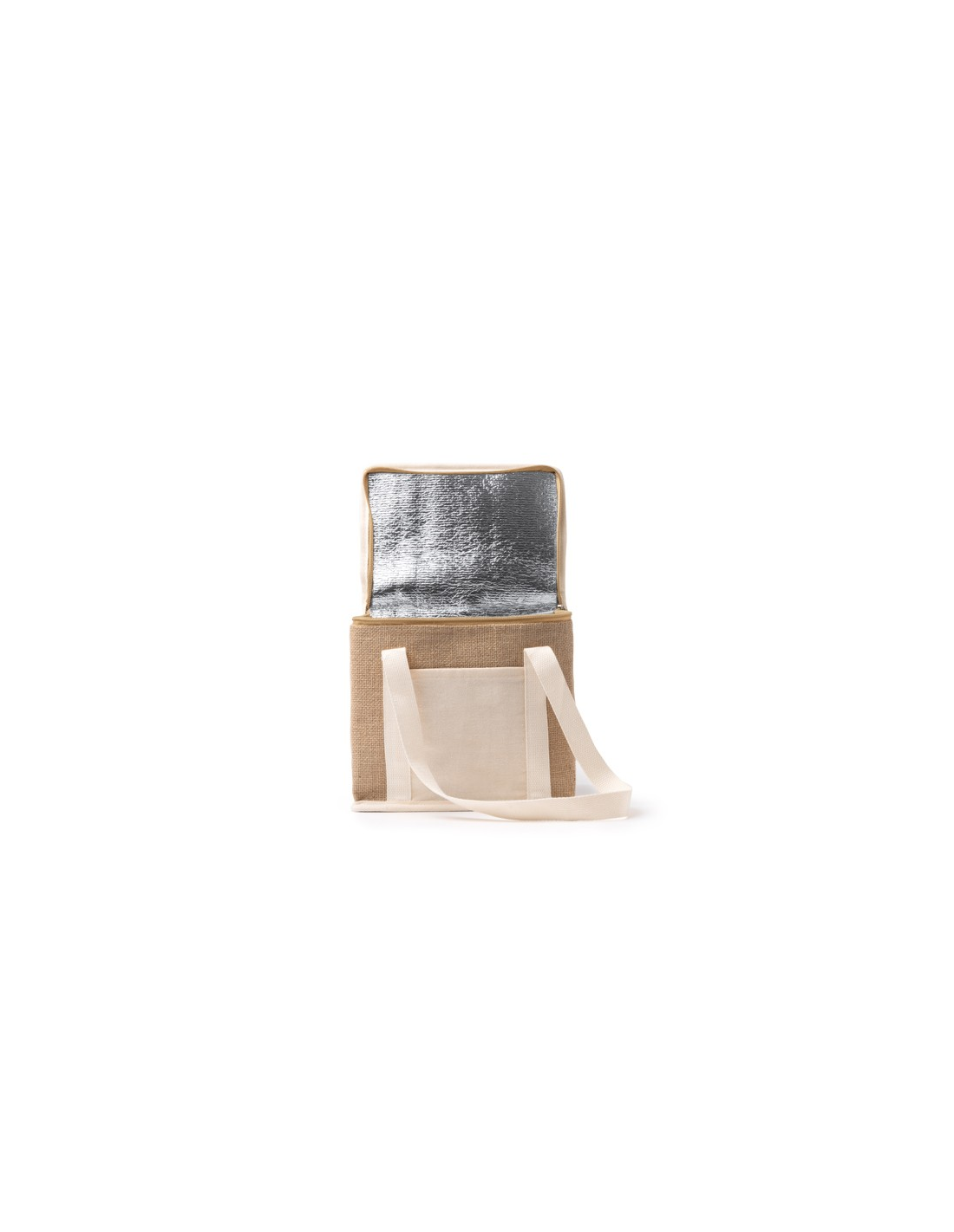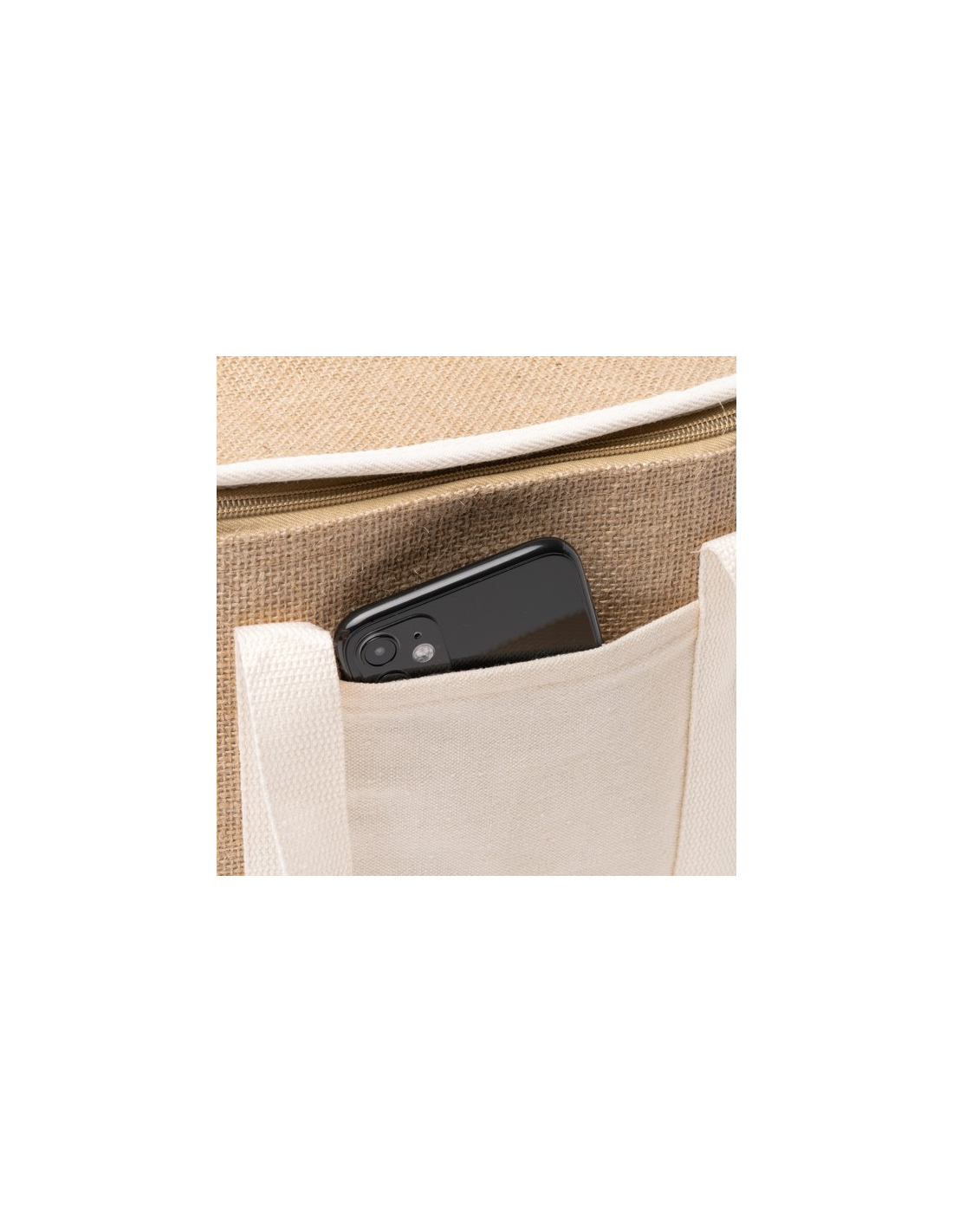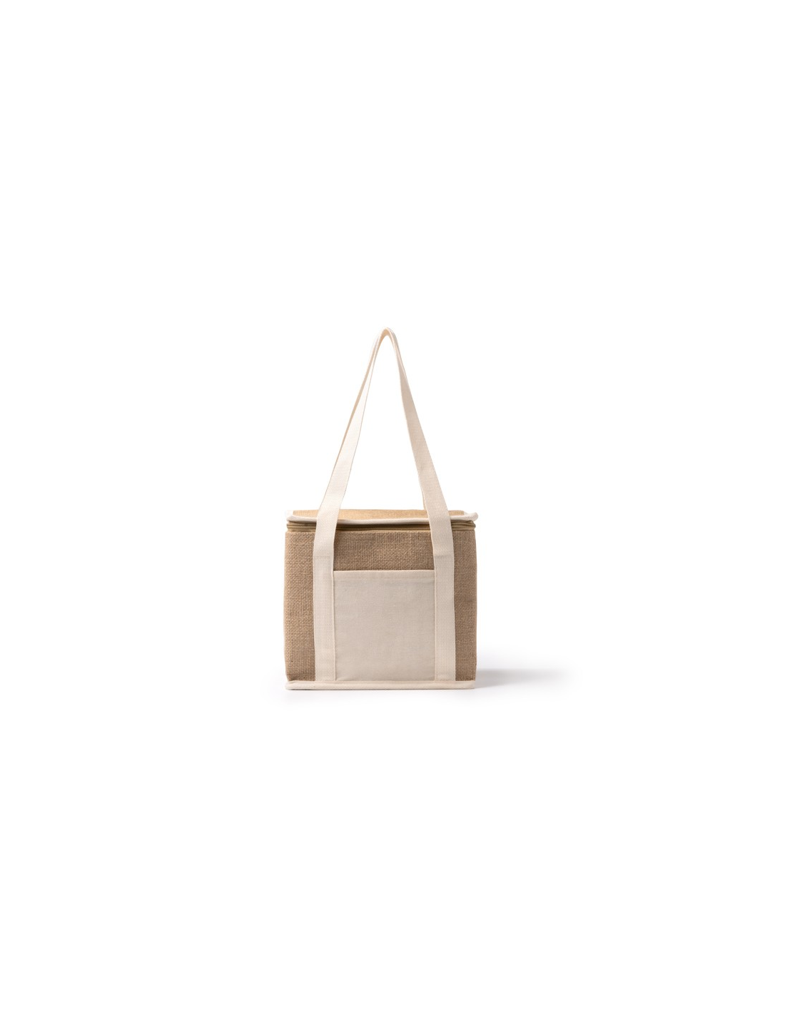 Jutowa torba termiczna z przednią kieszenią wykonaną z bawełny. Komora główna z podszewką izotermiczną o aluminiowym wykończeniu. Bawełniane uchwyty do przenoszenia w zestawie.