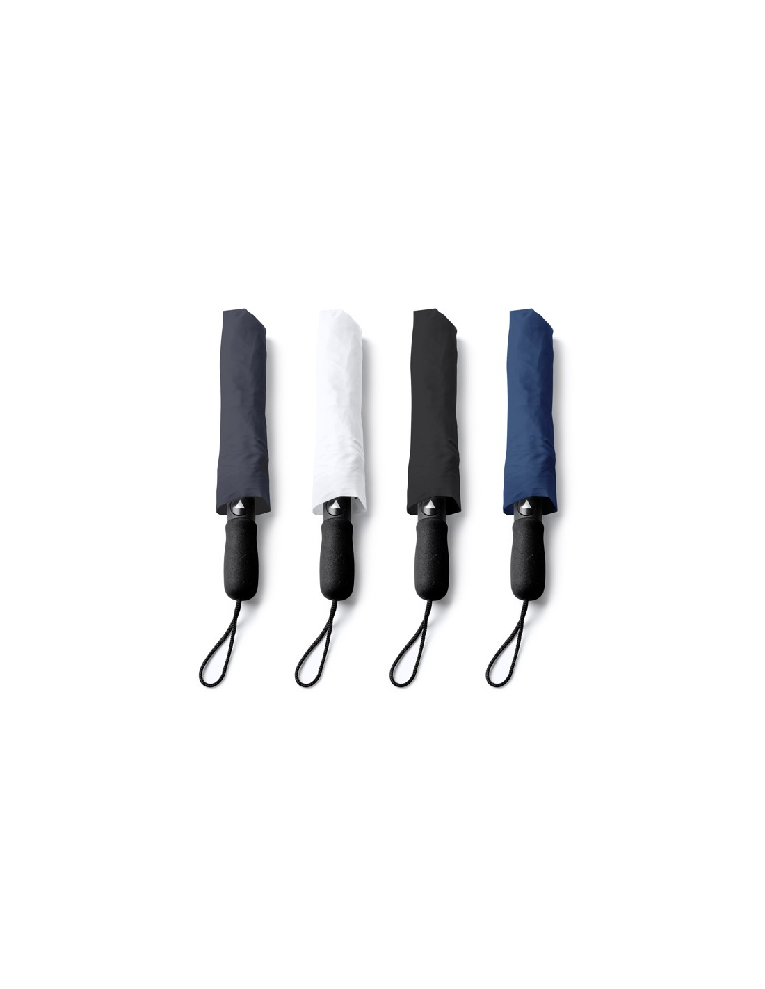 Guarda-chuva dobrável com abertura automática. Tecido pongee 190T com bolsa condizente. Cabo EVA e costelas de metal preto.