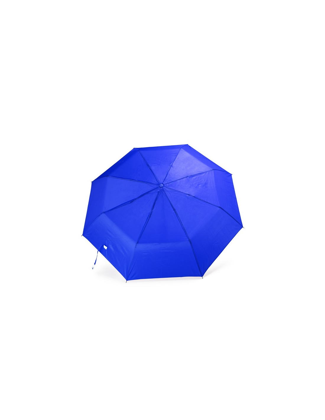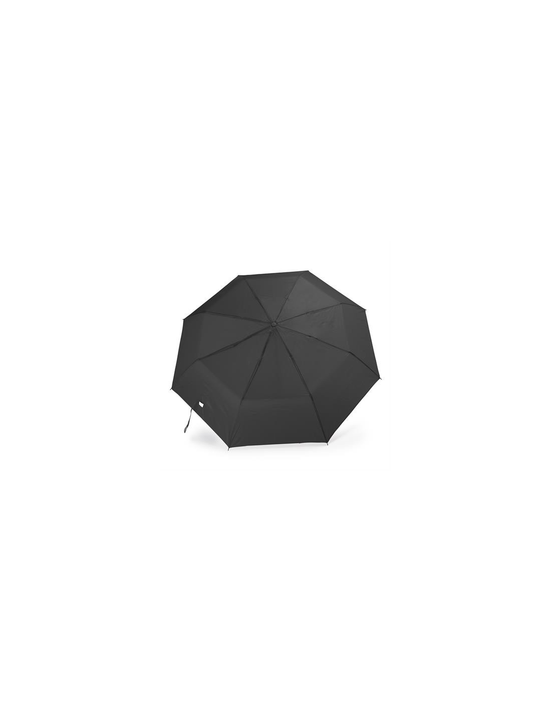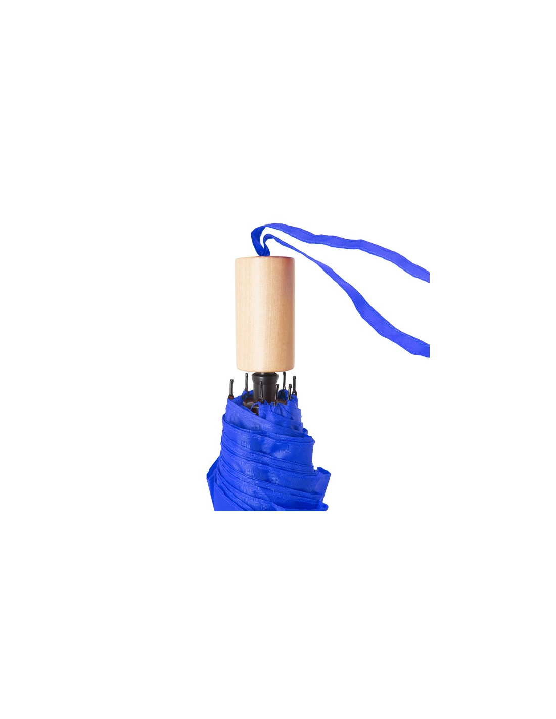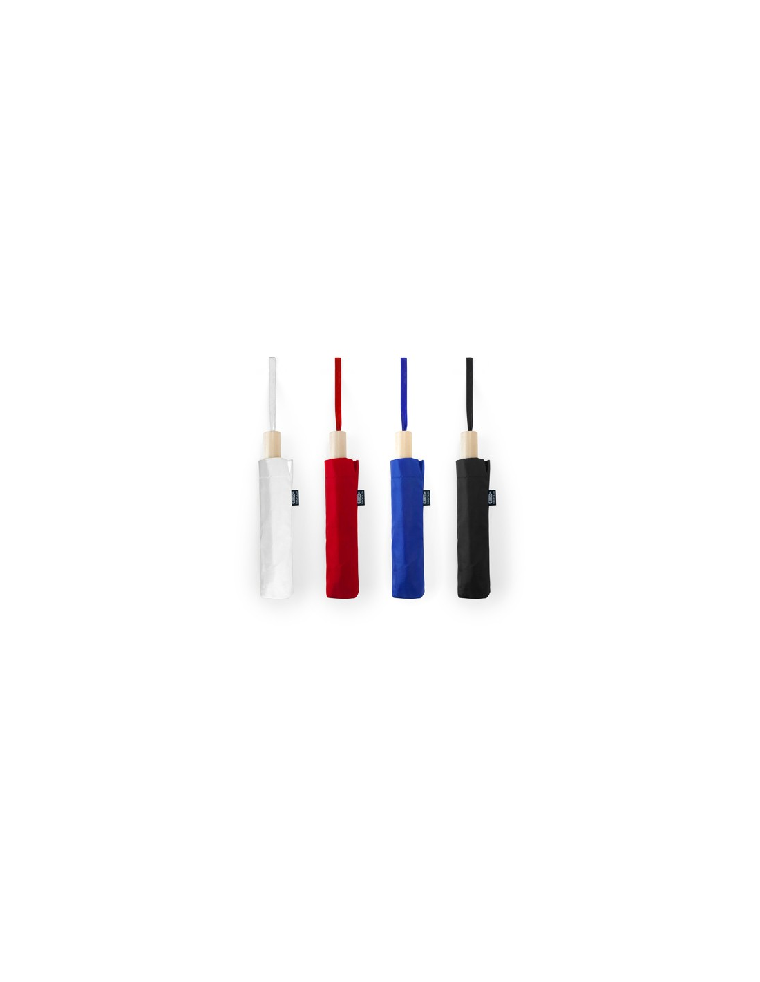 Składany parasol z pasującym pokrowcem. Trzcina, żebra i końce w kolorze czarnym. Rękojeść z naturalnego drewna. Dopasowane zamknięcie na rzep i ręczne otwieranie.