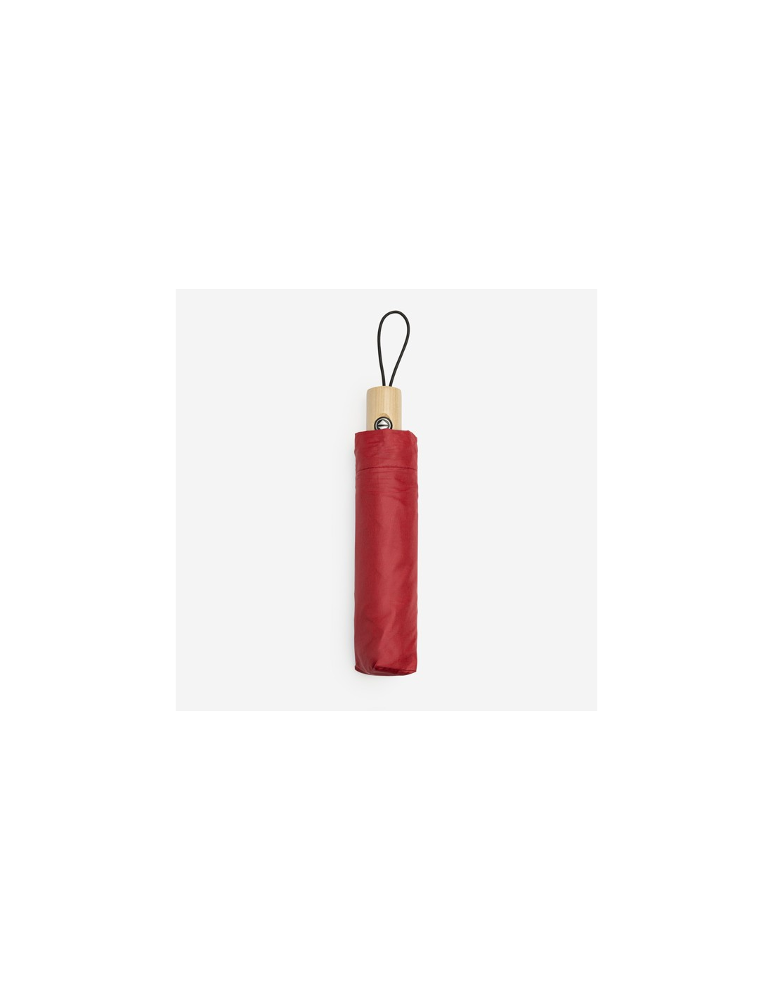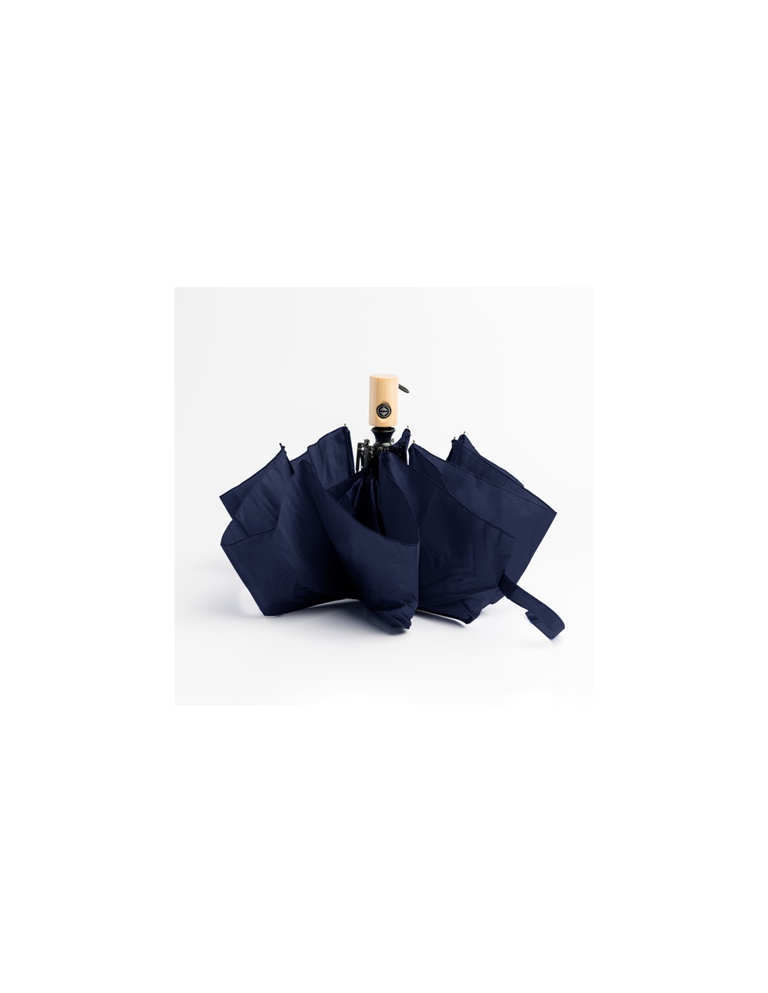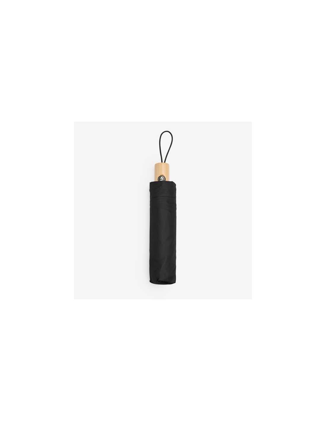 Parasol automatyczny wykonany z pongee 190T z pasującą saszetką. Stelaż i końcówki w kolorze czarnym z bambusowym uchwytem. Dopasowane zapięcie na rzep.