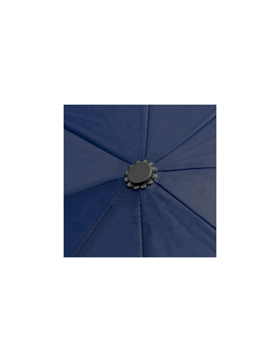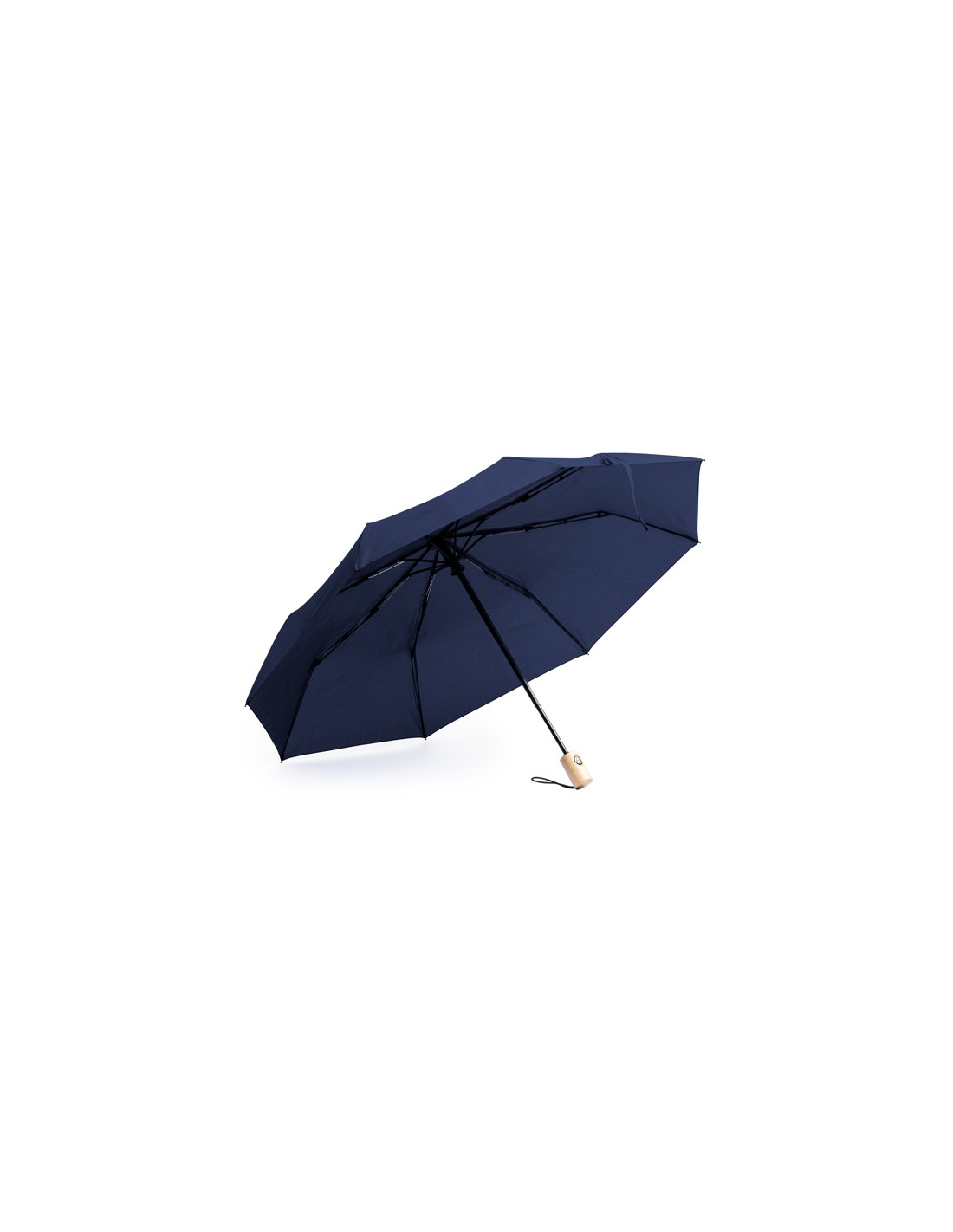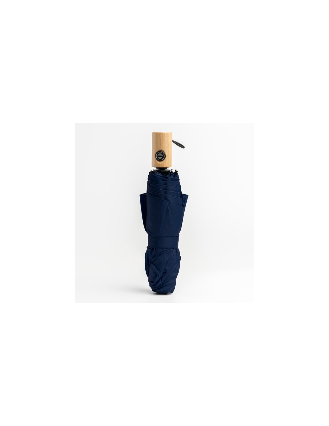 Parasol automatyczny wykonany z pongee 190T z pasującą saszetką. Stelaż i końcówki w kolorze czarnym z bambusowym uchwytem. Dopasowane zapięcie na rzep.