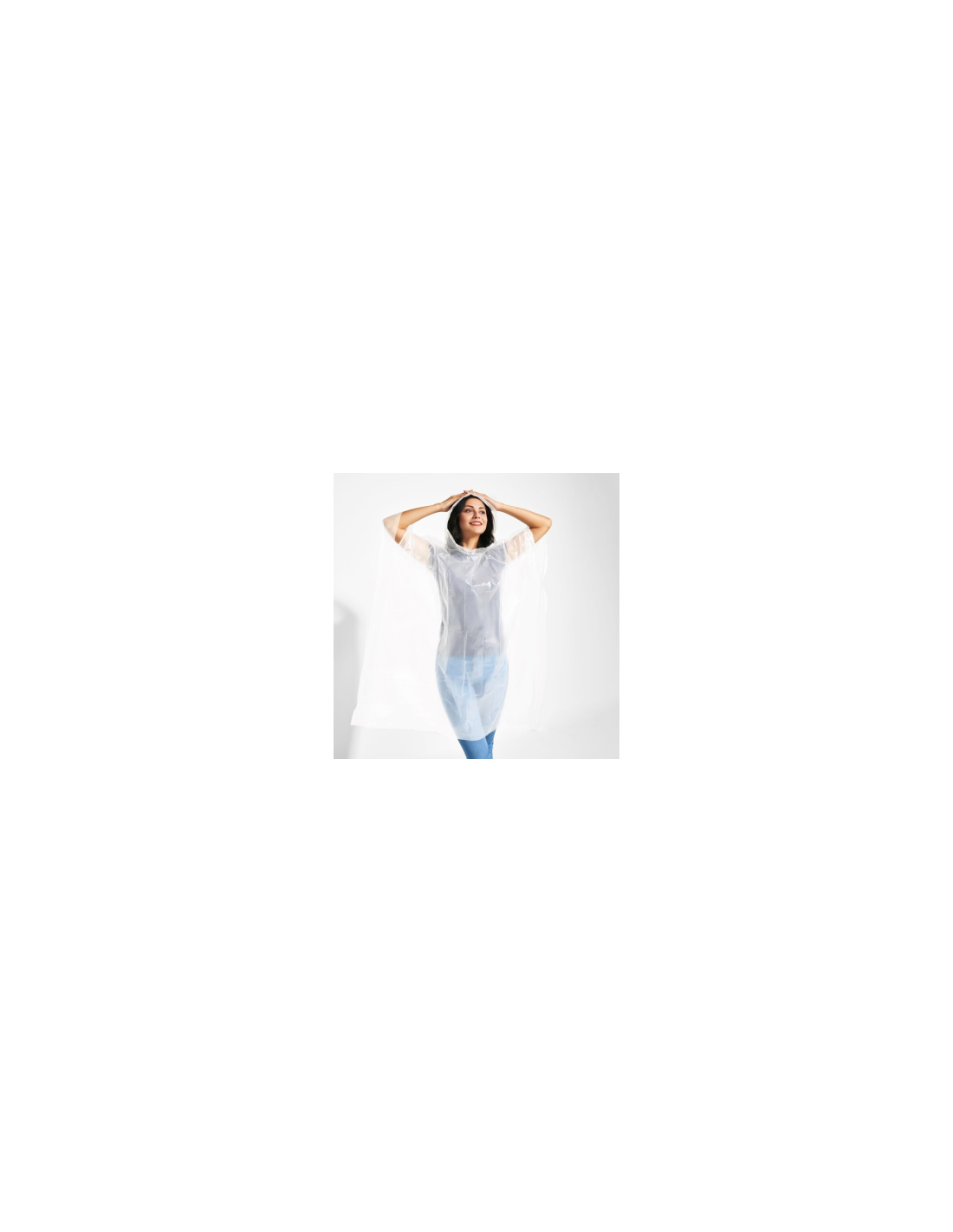 Kompostowalne poncho przeciwdeszczowe. Przezroczysta, z kapturem i otworem na ramiona. Prezentacja w osłonie PLA o wymiarach 10 x 13,5 cm.